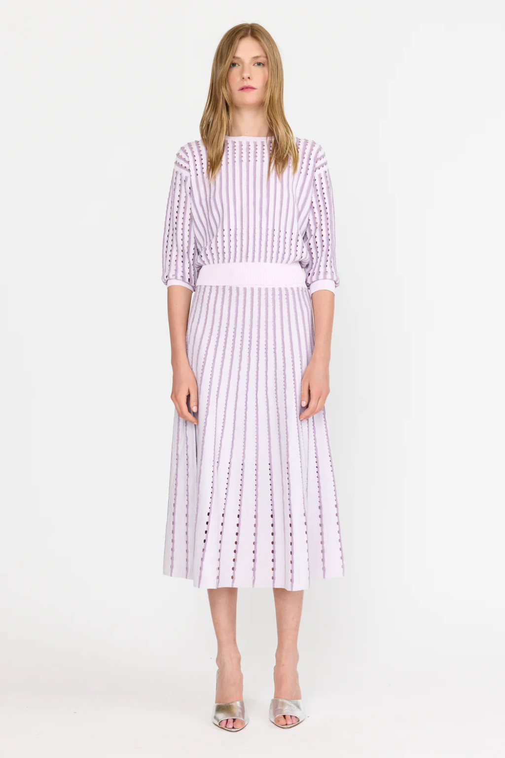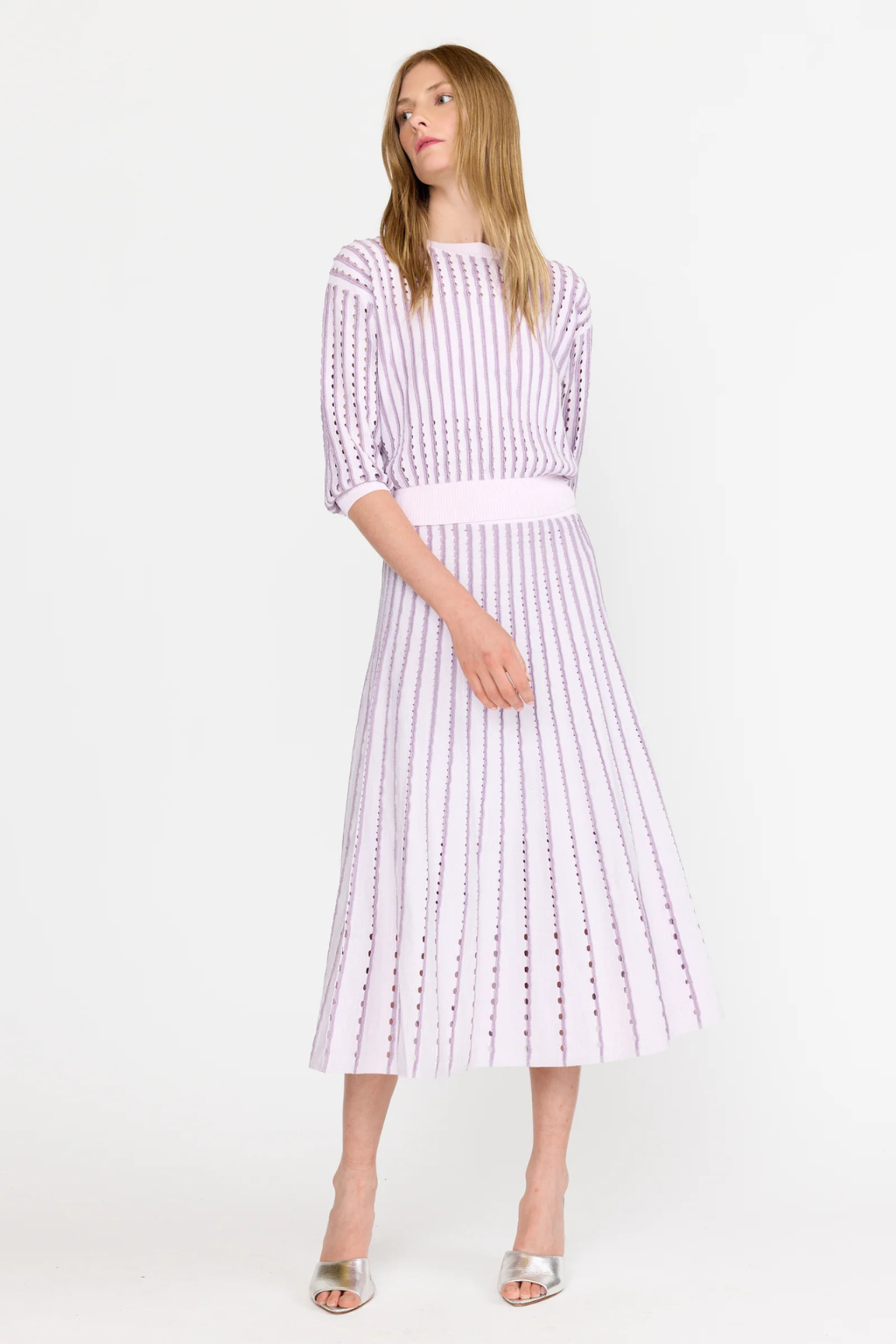 The Anya Sweater is a refined open-knit top designed with soft structure and delicate dimension. Crafted in Pinstripe Lilac knit, this style features a classic crew neckline, three-quarter sleeves, and a gently blouson silhouette that sits effortlessly at the waist. Vertical striping is finished with a subtle metallic thread, creating a luminous touch that catches the light beautifully. Designed to pair with the matching Colton Skirt, Anya brings a polished, feminine feel to everyday dressing.
