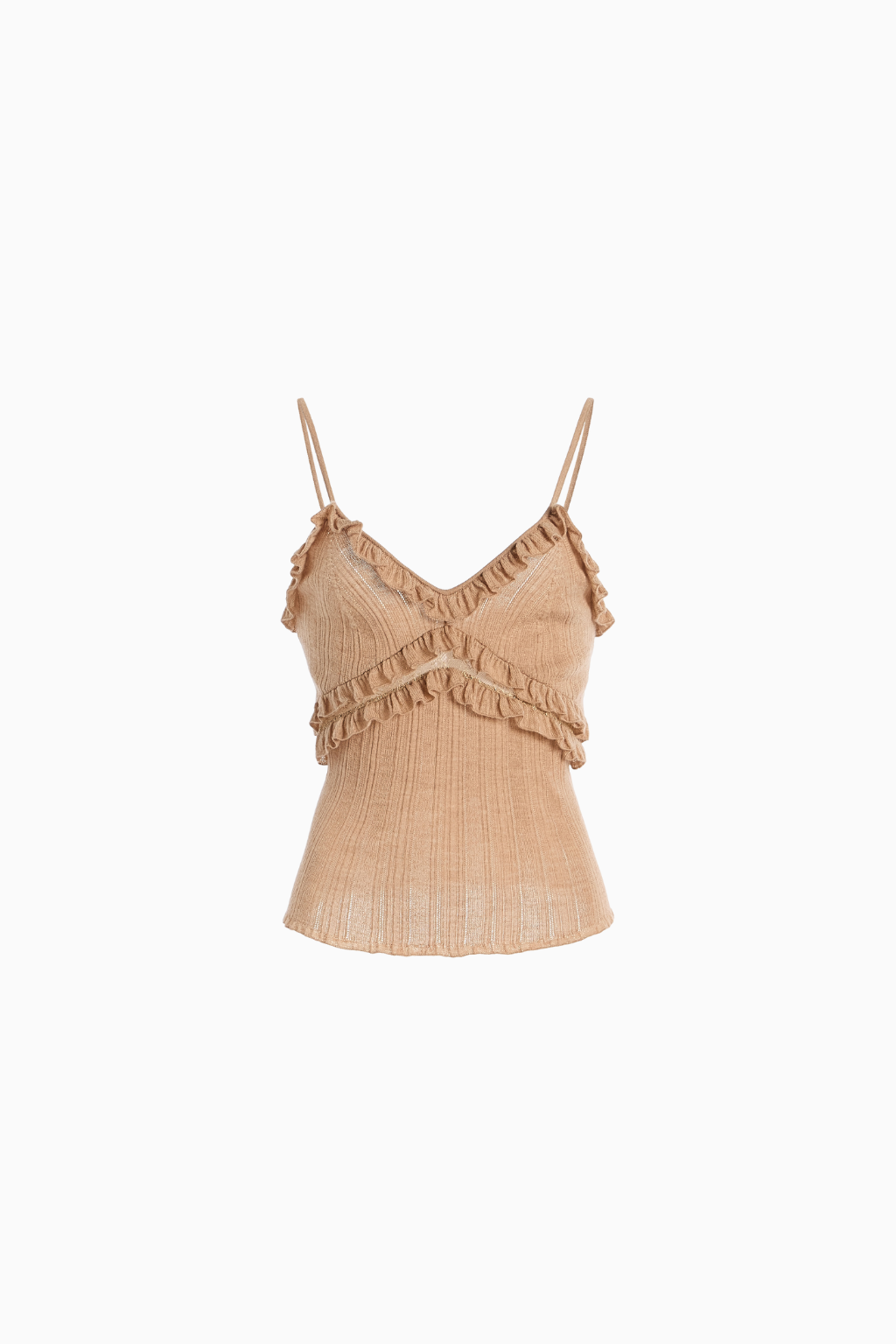 Debuting in Look 20 on the AW25 runway, the Anthia Top is a confection of delicately cascading ruffles and lace intarsia in pure merino wool. Softly ribbed in texture, this beige top features a slim silhouette perfect for layering beneath tailored separates or wearing on its own. Designed for a close fit.