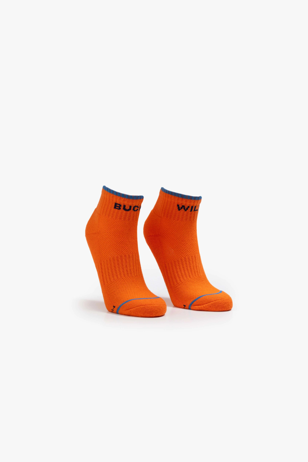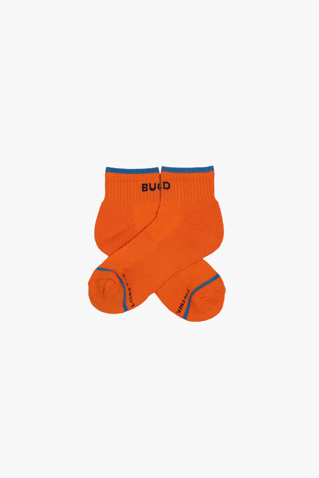 Buck wild. Ankle-length tube socks with a subtle heads up from MOTHER. Shown here in orange with blue text and details.