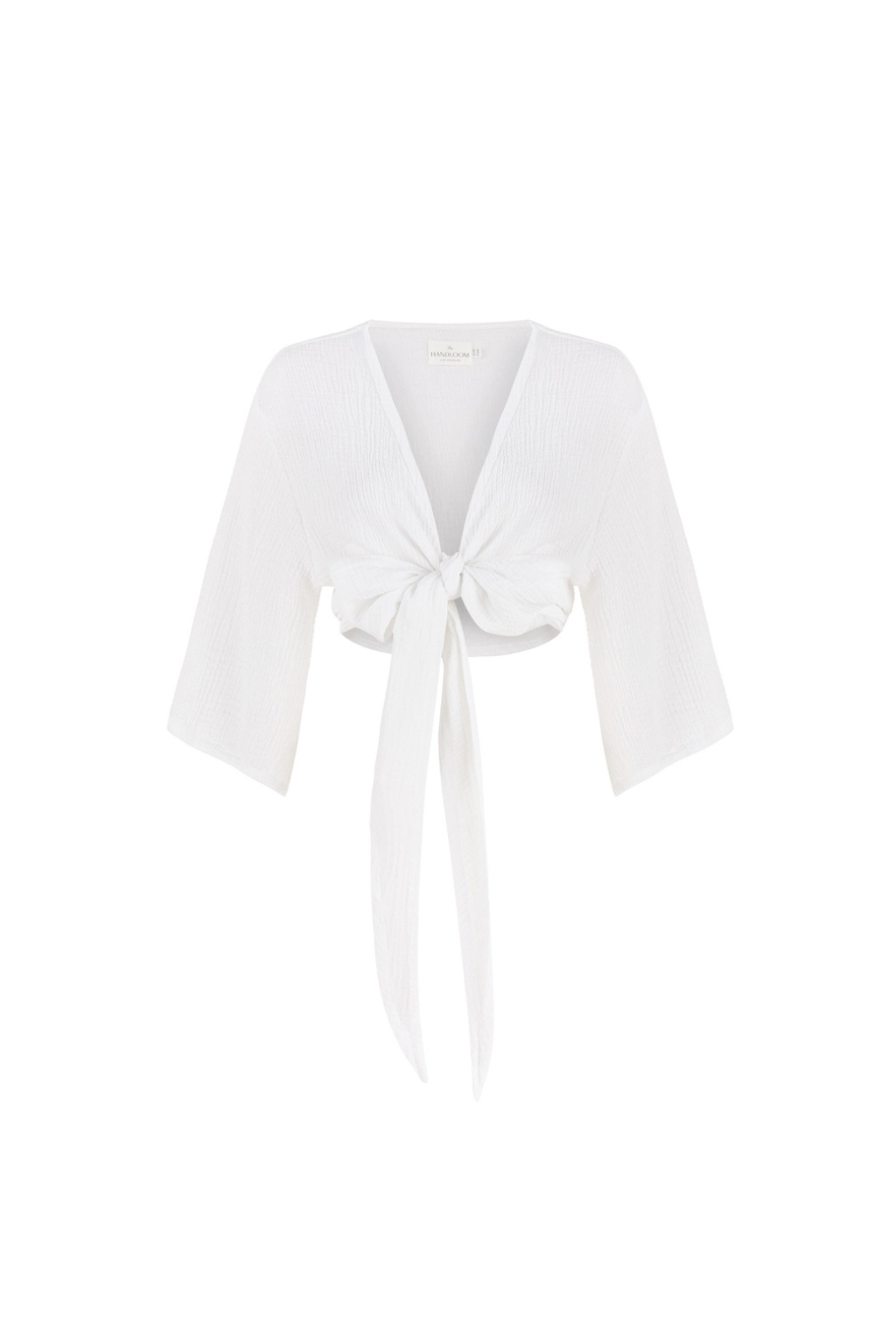 Get lost in the romance of the Bali wrap top: a bold tie front style that exudes the essence of lounging in paradise. A voluptuous front tie allows for customizable wear and wide sleeves keep your look breezy and light. Wear with the Boy Shorts or Skye Pants for a matching set or pair with cutoffs for a breezy summer look.