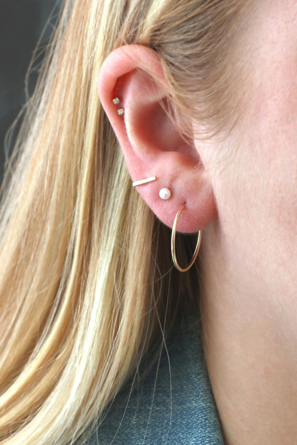 Classic Bar stud earring with a threadless flat back push pin style backing in 14k gold. Bar design measures 9mm length bar. Threadless Flat back pin measures 6mm length, 20 gauge thickness. Perfect for wearing 24/7 and never taking off. The flat pin back makes earrings comfortable enough to wear during sleep and all of life's adventures.