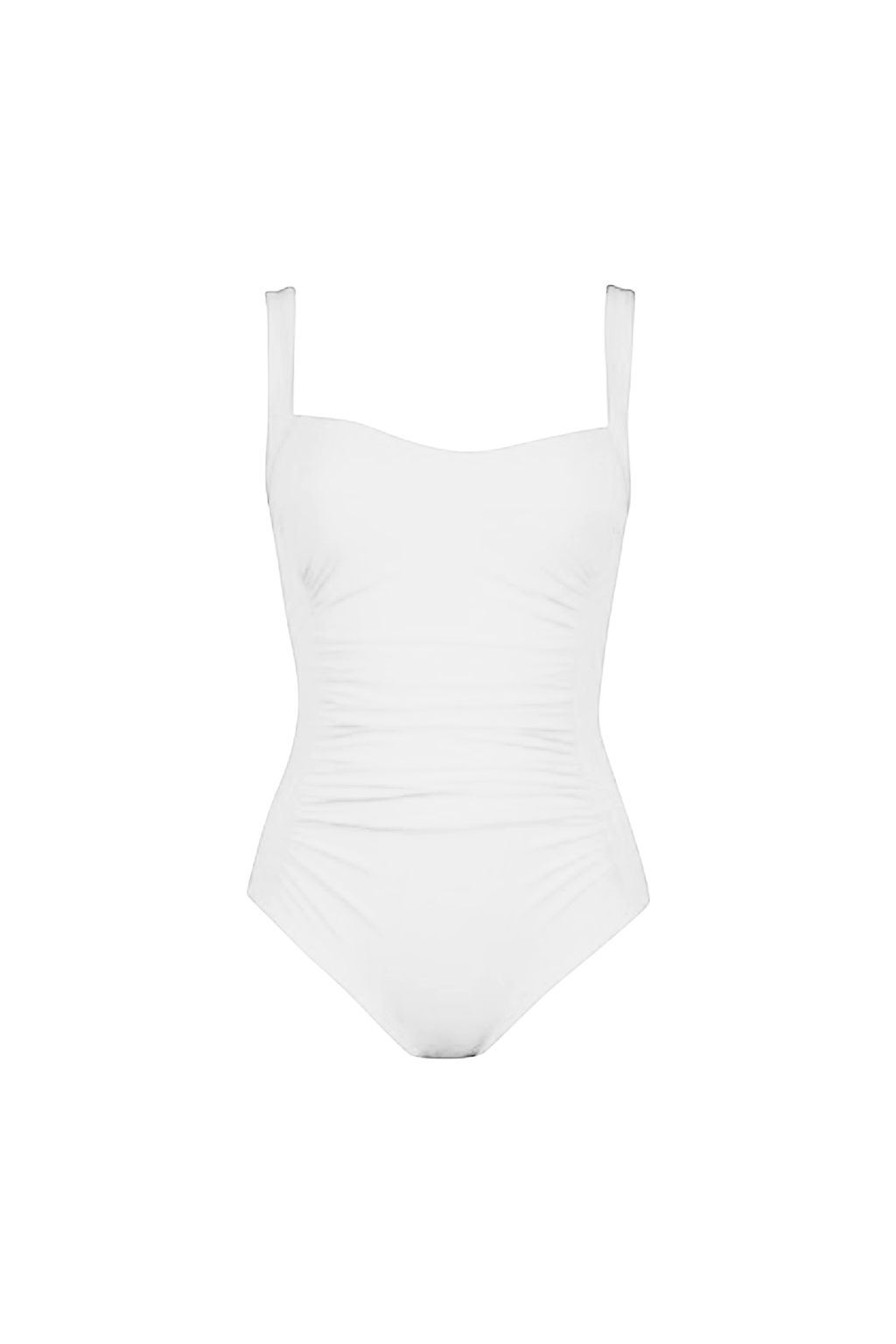 Thoughtfully placed ruching and a subtly shaped neckline define this figure-sculpting one-piece fit for a coastal getaway. Color available is WHITE