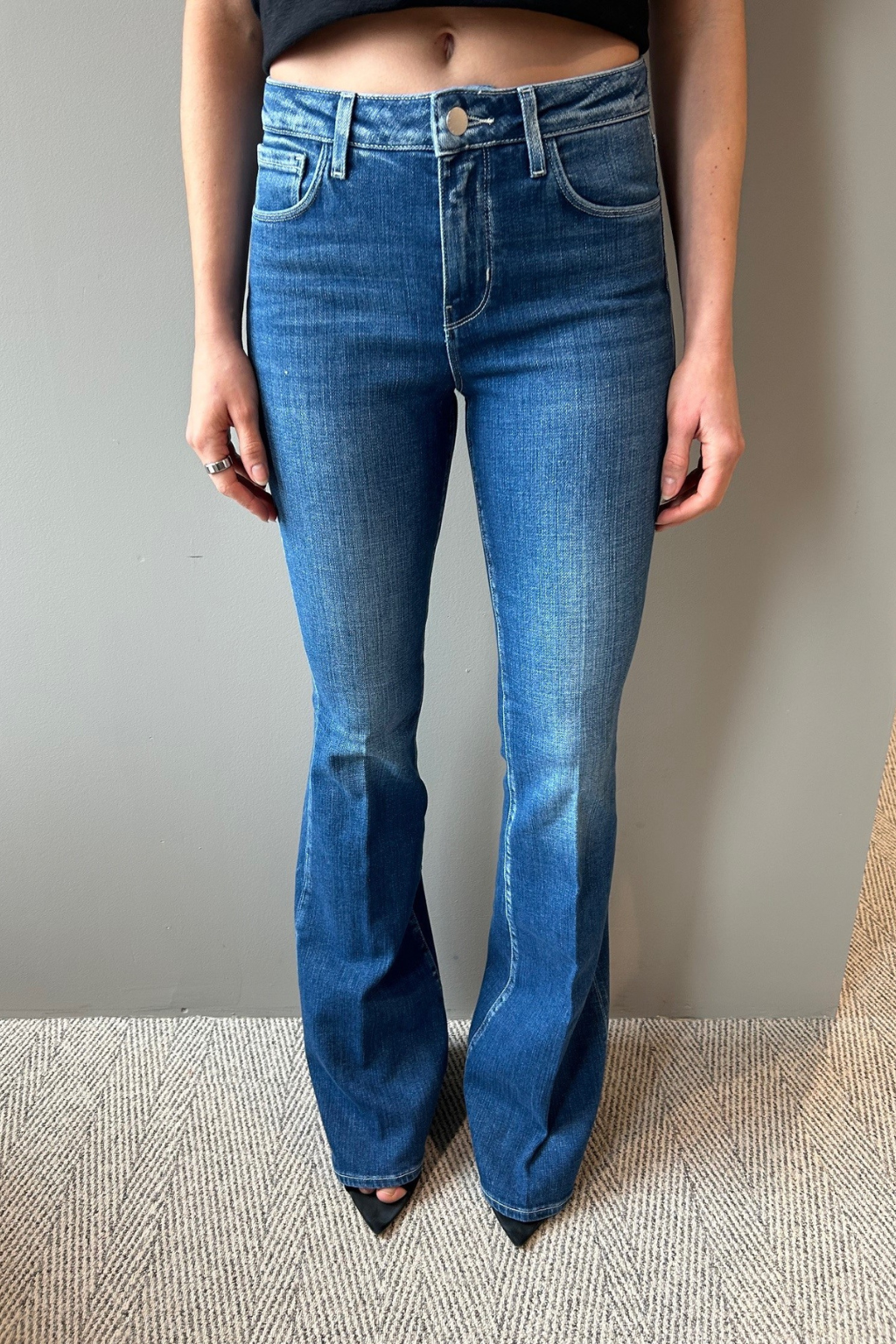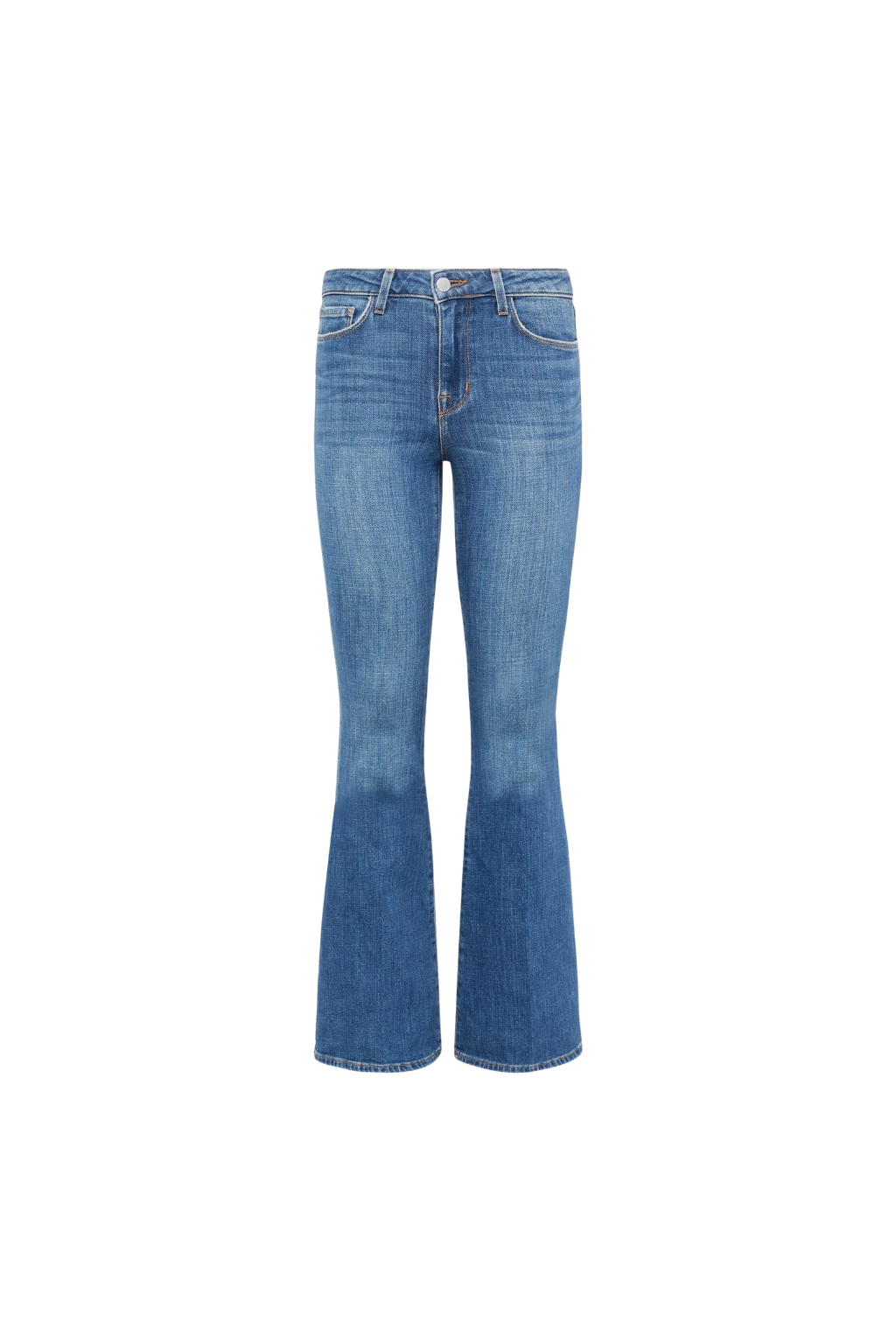 A vintage-inspired bell-bottom jean in aged wash with beautiful highs and lows. This premium stretch denim in a medium blue hue has a contoured waistband that fits securely around the natural waist as it smooths and slims, while the premium stretch denim hugs hip, thigh, and fitted through the knee before releasing into a sleek straight leg which can be altered up to 4" without drastically changing the shape.
