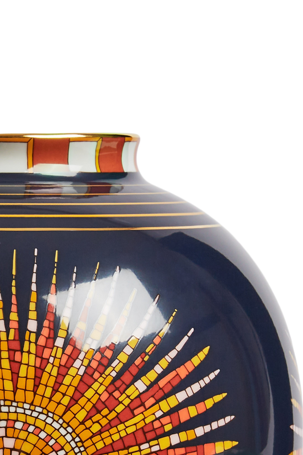 Any maximalist interiors diva will tell you a bold vase maketh the table and this beauty in a striking Sunrays print inspired by a mosaic found on the floor of Palazzo Belgoioso, might just make for LDJ's most stunning centerpiece to date. Painstakingly crafted by Verona-based porcelain legends. It arrives with hand-painted details and bold color pigments that enhance the richness of the print. Don’t miss the opulent 18K gold rings that flow from the base and crown like radiant ripples!