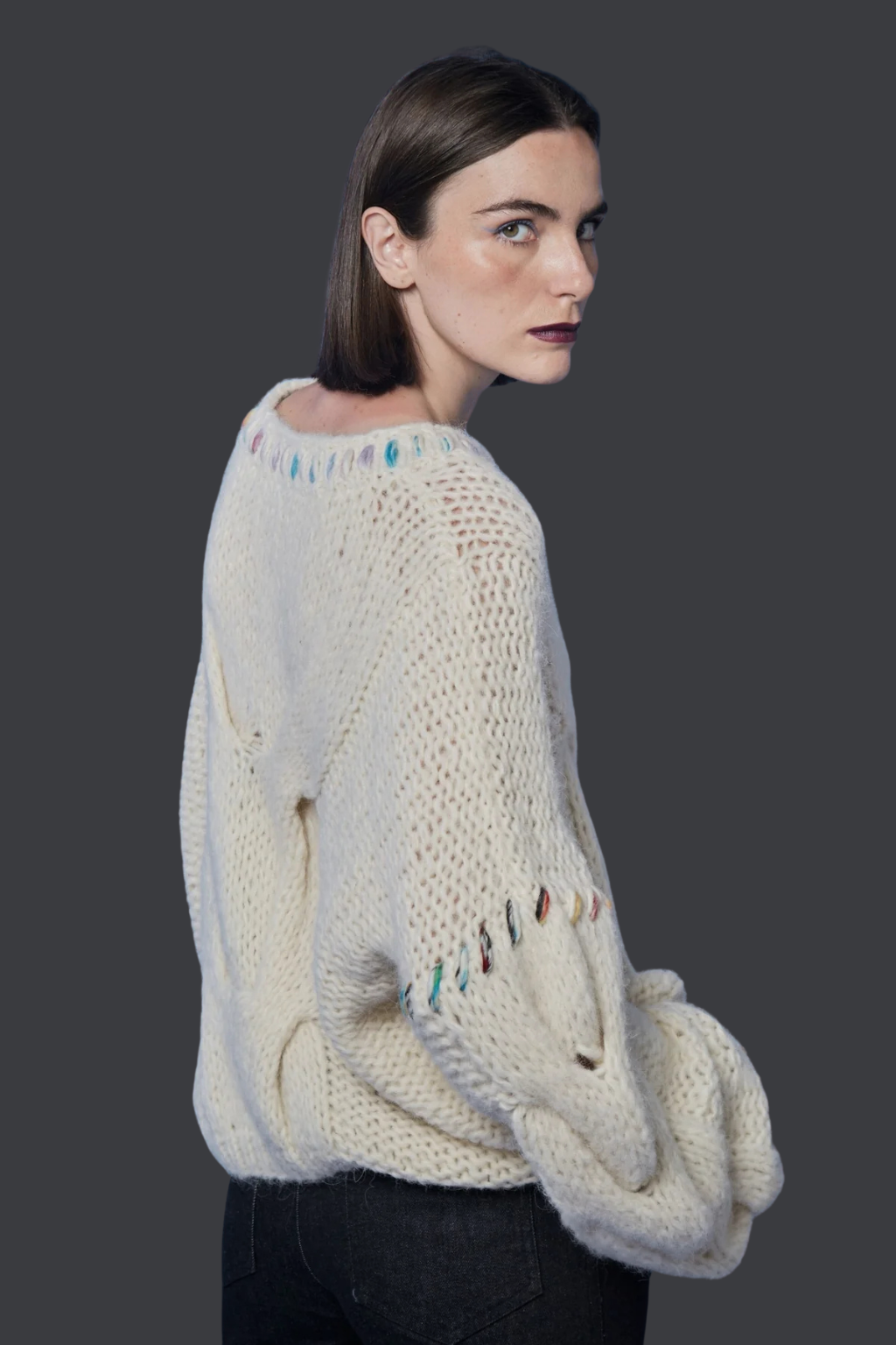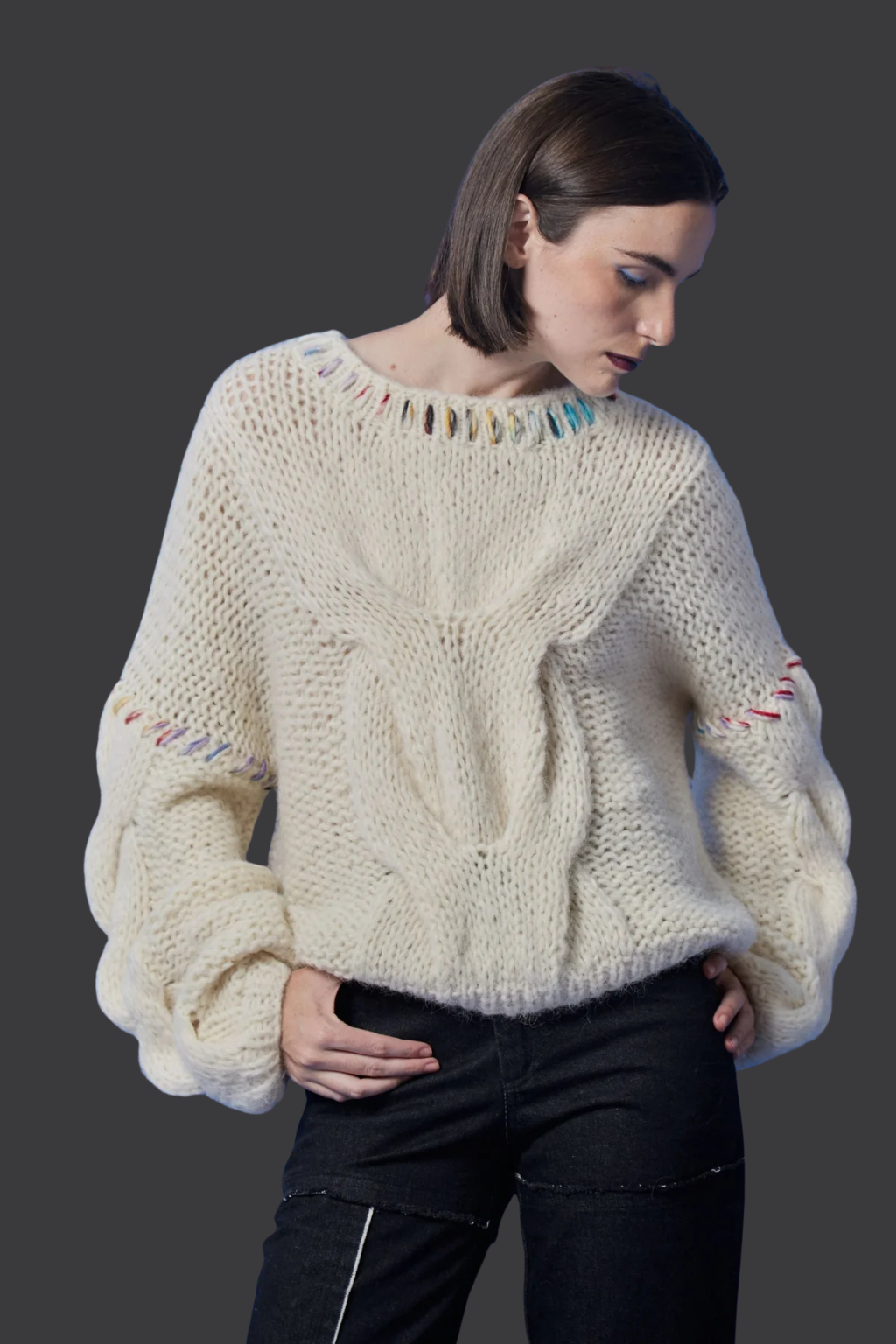 The Candice Sweater is a loose weave drop shoulder pullover with an oversized cable pattern running down the center front and on each sleeve. Multi colored stitching at the neck and armhole give it a little fun flare. Woven from a blend of alpaca known for its unmatched softness and natural warmth and pima cotton which provides extra softness, durability, and is hypoallergenic.