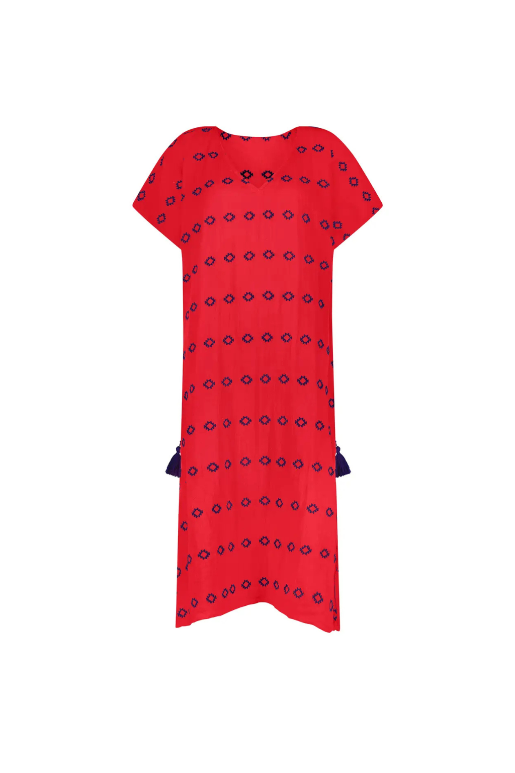 Envelope yourself in this timeless boho chic caftan. Relaxed drop shoulders, embroidered detailing and a deep V make this one-size-fits-most beach-to-lunch cover up stand out. With cotton gauze construction and a maxi length, you'll look fashionable without sacrificing comfort.