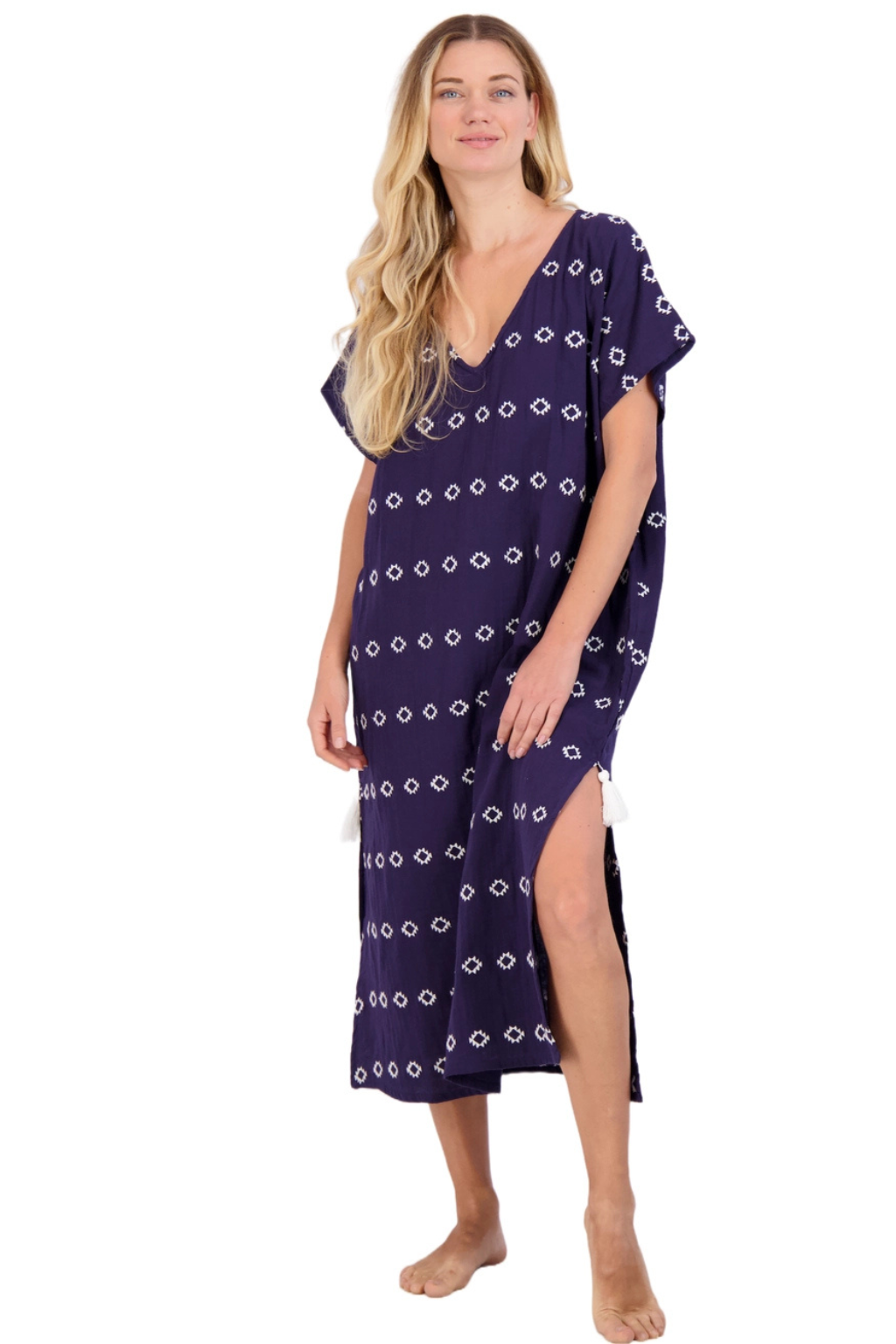Envelope yourself in this timeless boho chic caftan. Relaxed drop shoulders, embroidered detailing and a deep V make this one-size-fits-most beach-to-lunch cover up stand out. With cotton gauze construction and a maxi length, you'll look fashionable without sacrificing comfort.