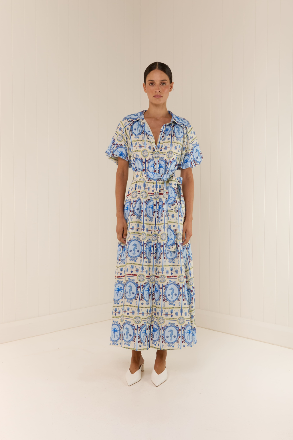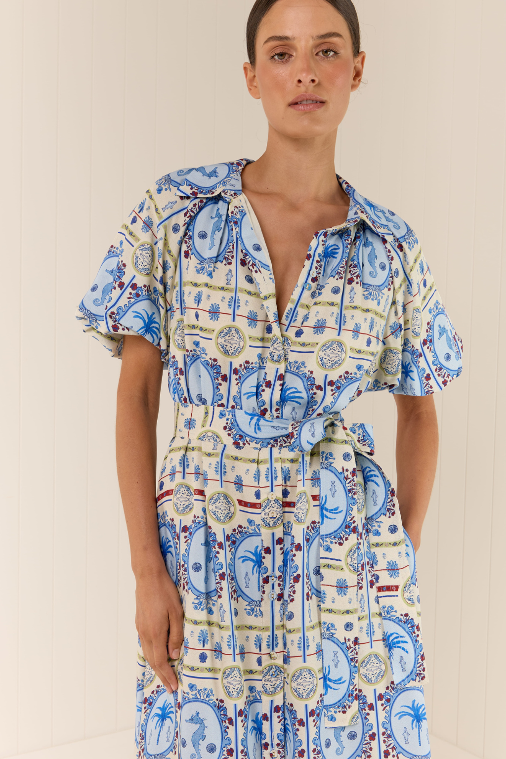 The Carla Dress is crafted from a premium Silk Twill Blend, in the exclusive Lagoona Tile print. Featuring a stand collar, voluminous blouson sleeves and an adjustable waist tie and side pockets to create a relaxed yet elevated look.