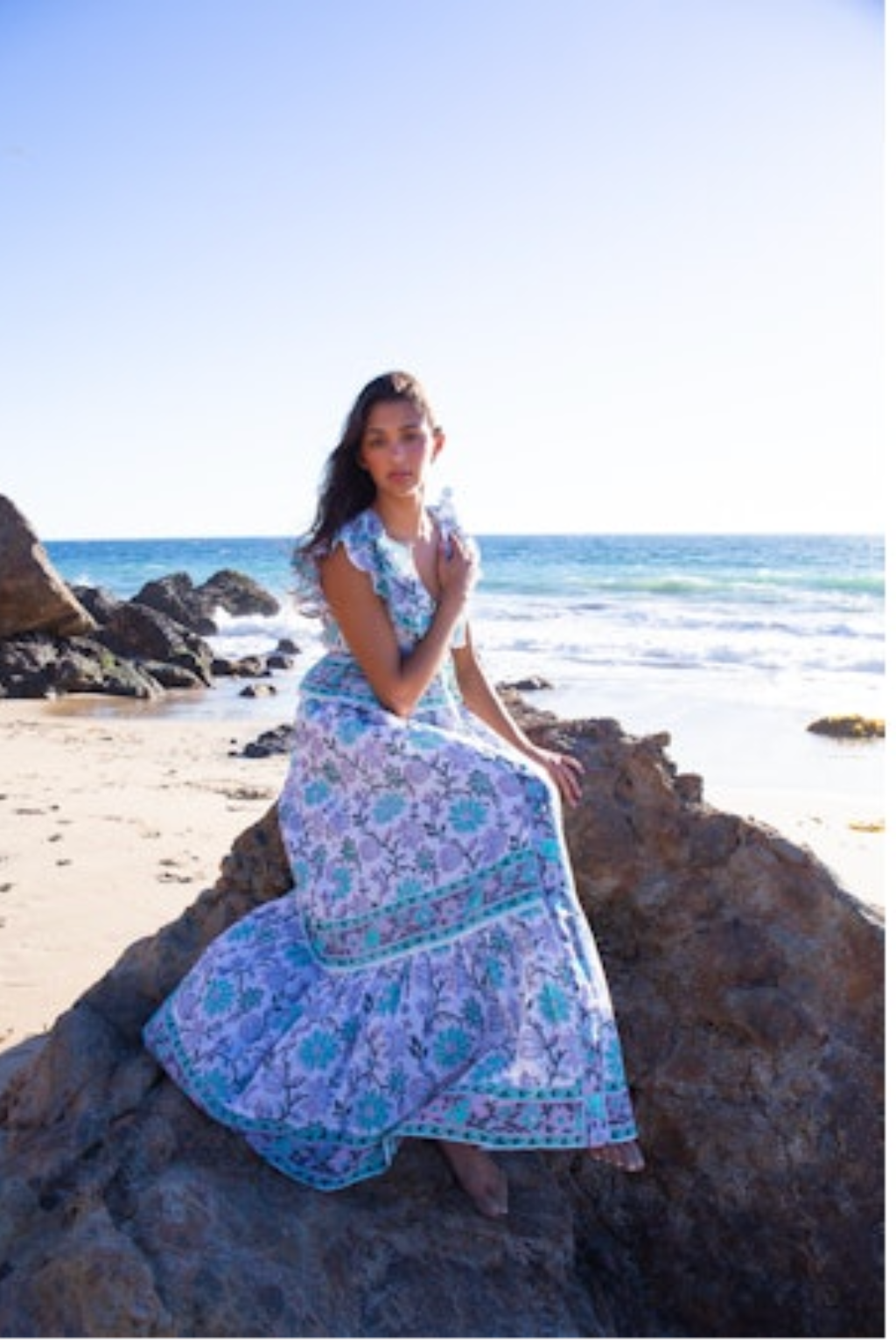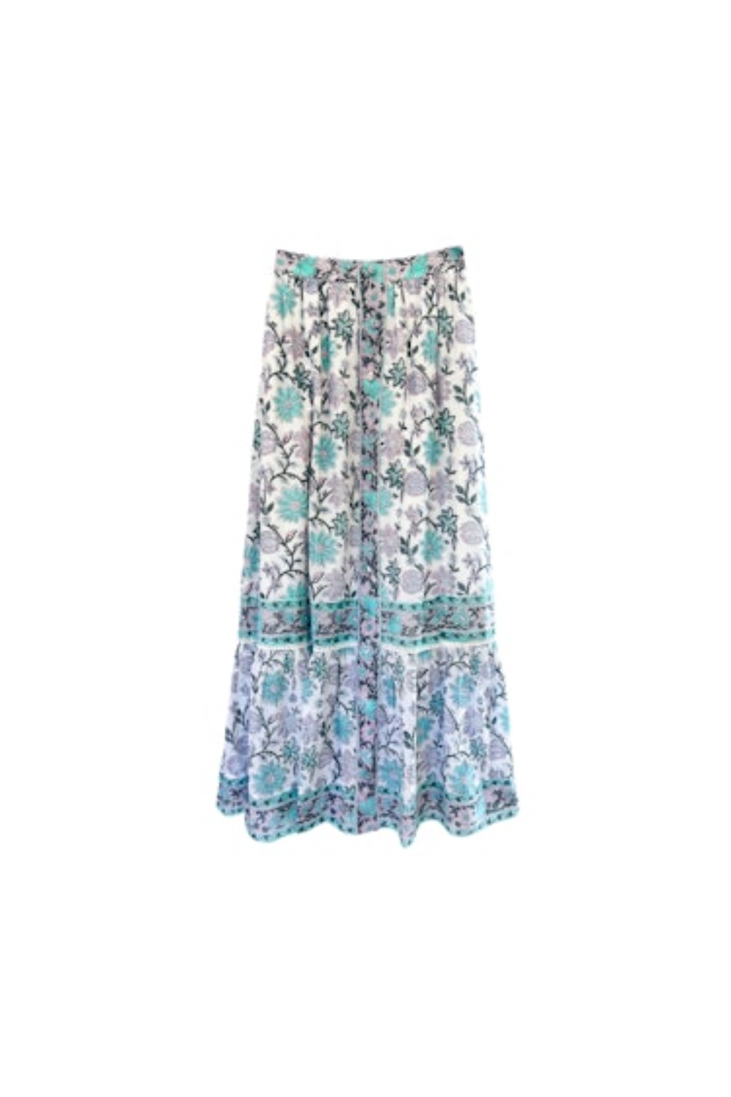 Silk cotton voile hand blocked drawstring waist tiered maxi skirt.