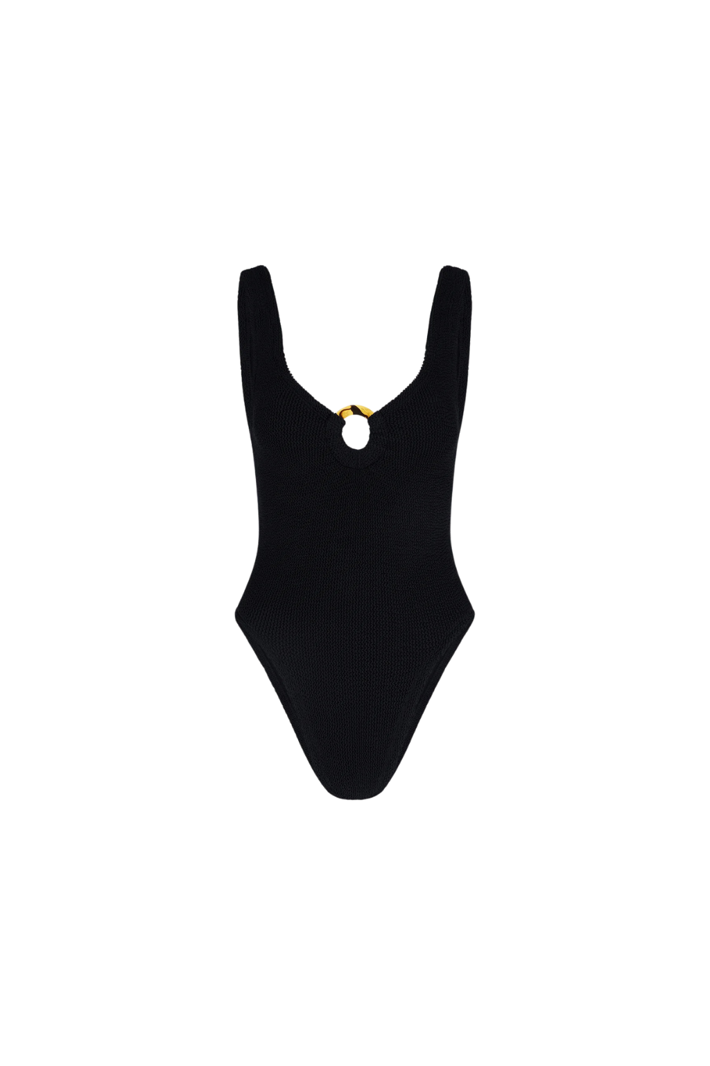 Modern swimsuit, timeless appeal. With tortoiseshell hoop detailing and a deep-v neckline, Celine has understated glamour down. Hunza's ingenious Original Crinkle™ fabric is designed to flex and sculpt to your body, which is why all Hunza G items are made in one size only. Anyone from a US size 2-12 can wear these items comfortably and confidently. Varying styles and shapes may sculpt and accentuate body shapes differently.