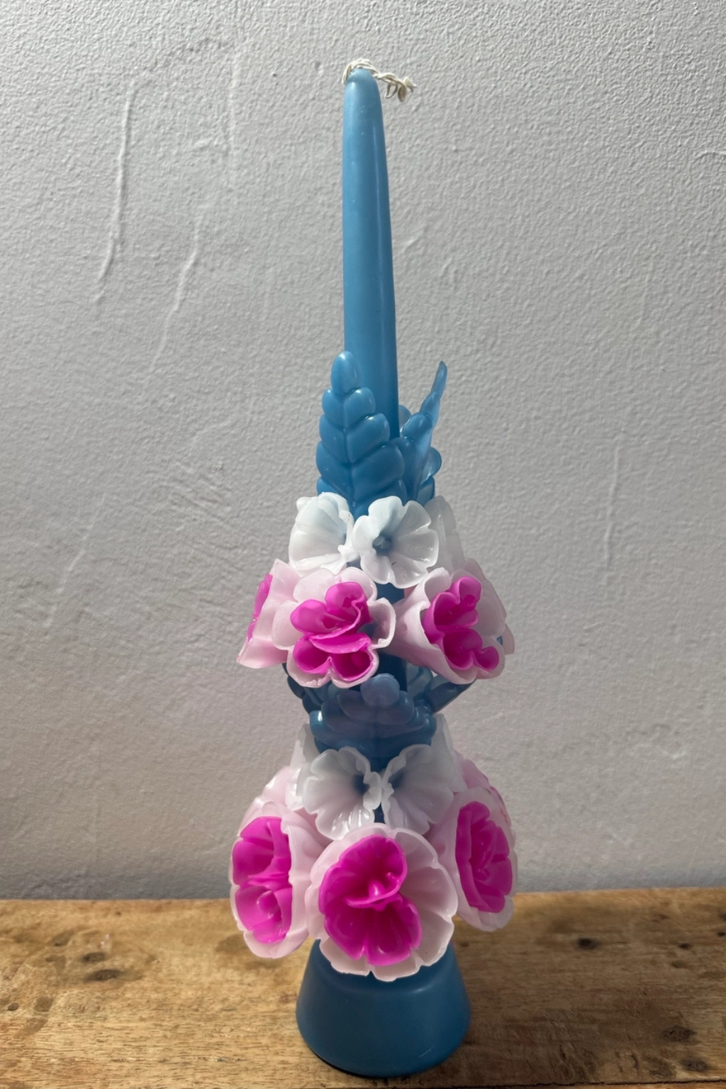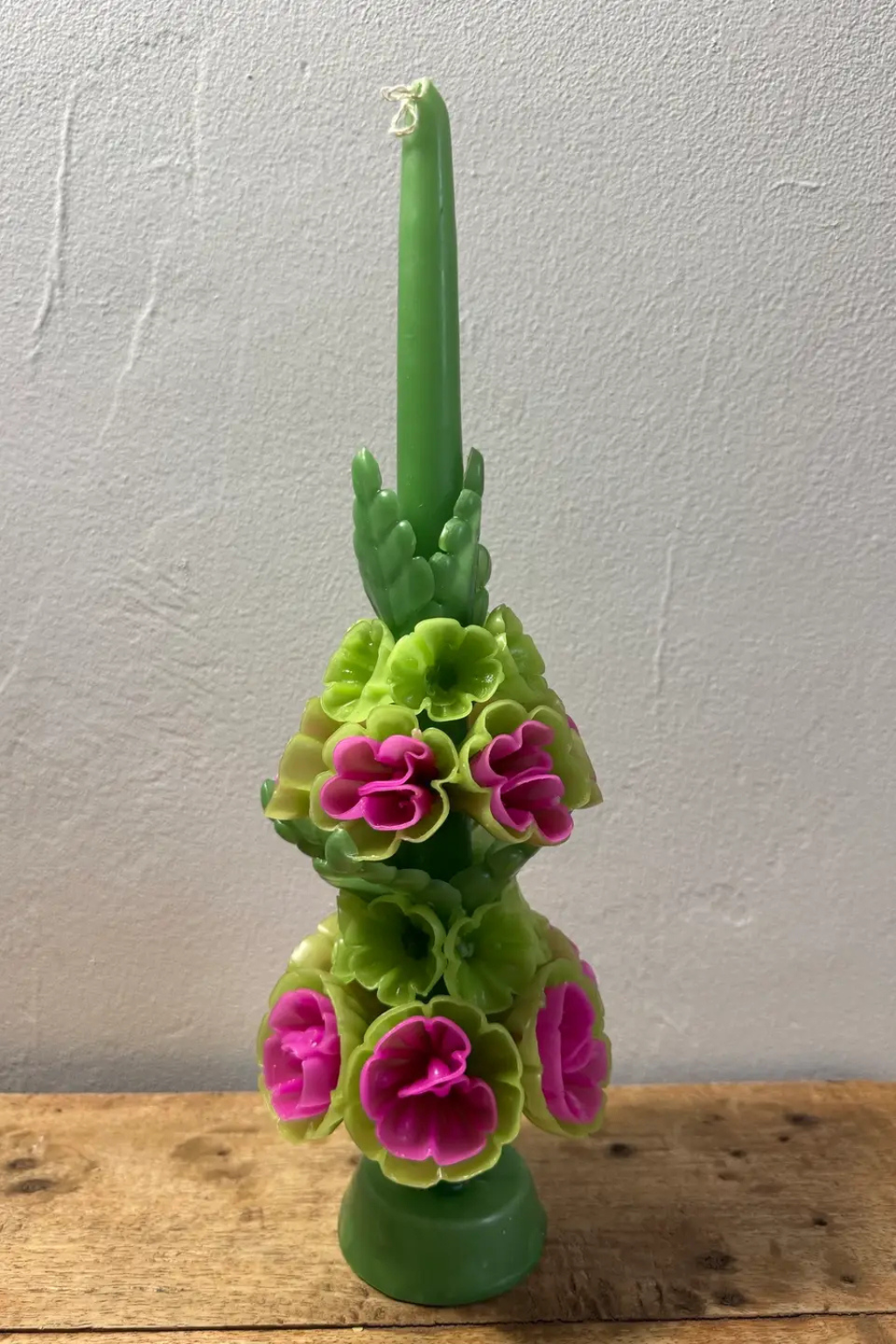 Handmade in Mexico, elegant and unique, this tall floral candle is a perfect gift. The variety of colors allows one to mix and match to your personal palette. Stunning to burn or also lovely to leave as a decorative piece. Due to the craftsmanship, slight variations in size, texture and color may occur. Candles are quite fragile and must be kept away from extreme heat. For best results trim wick to 1/4 inch before lighting.