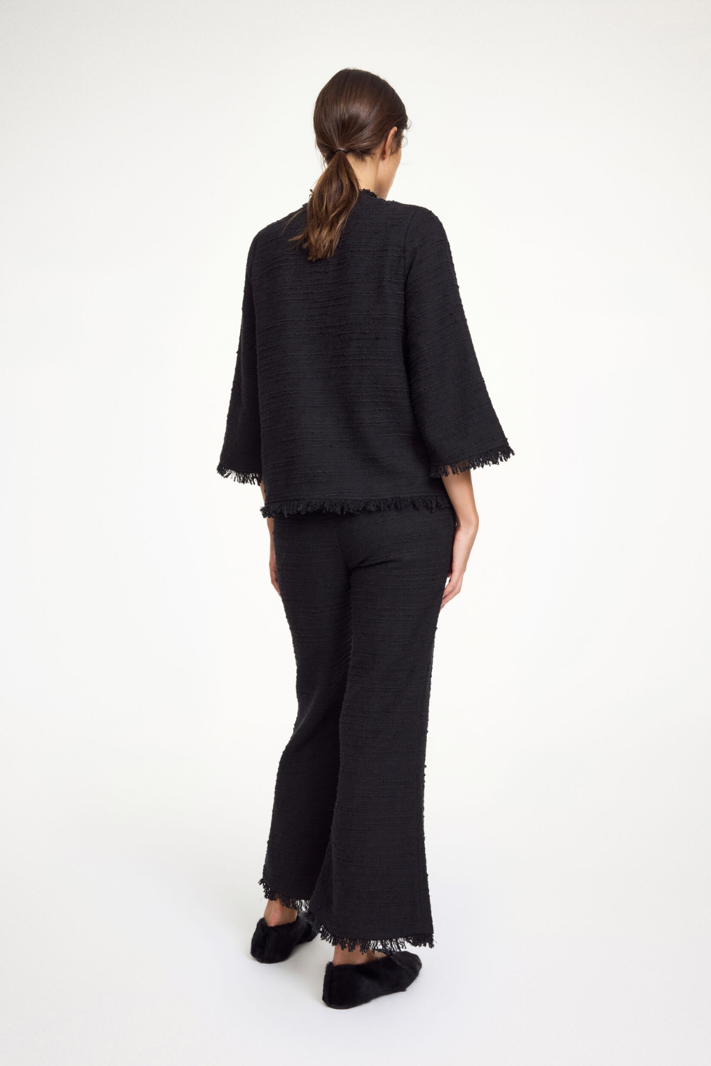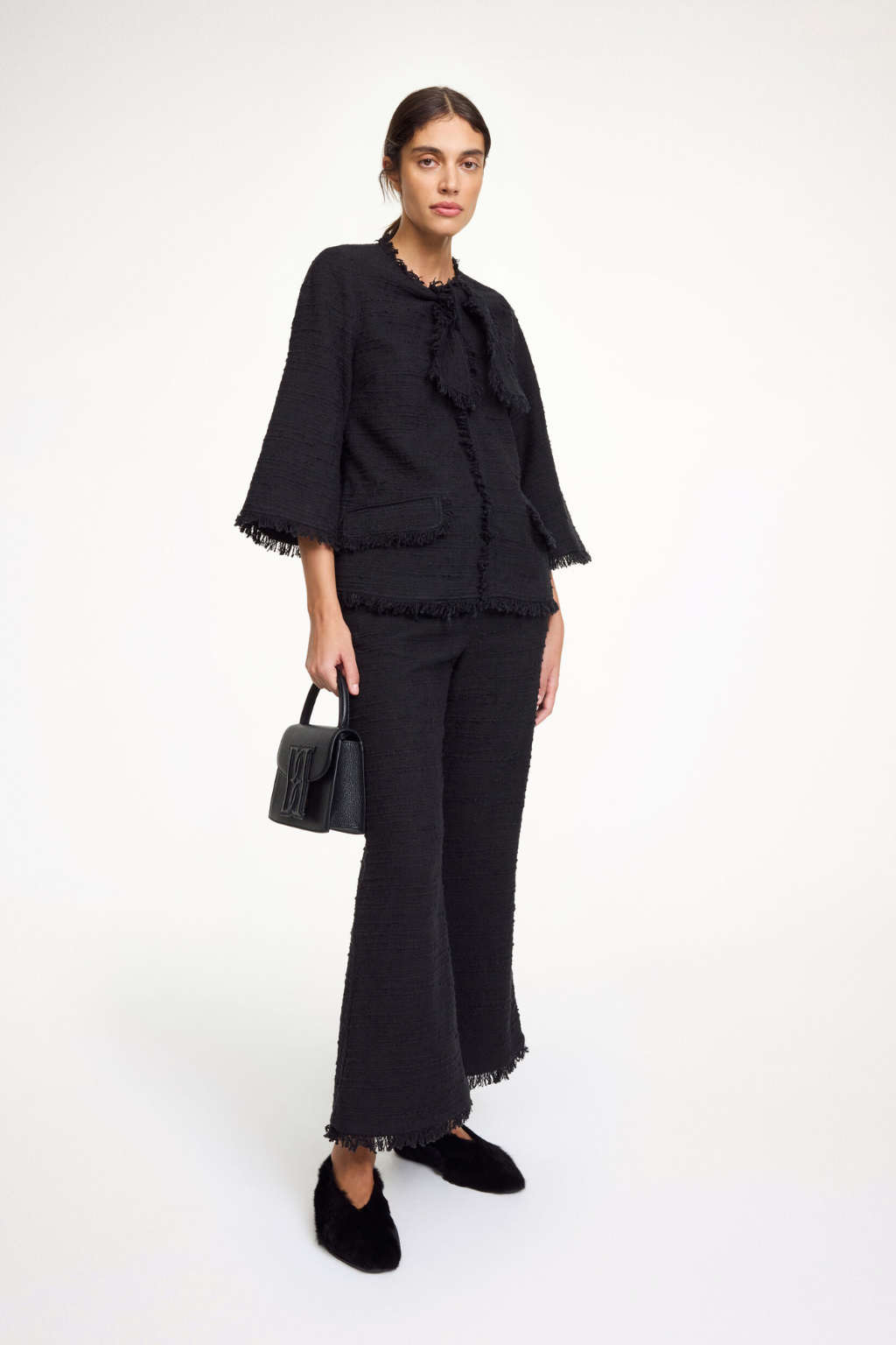 A chic and classic addition to your edit, the Diana boucle jacket is made in a tactile cotton mix. The feminine design is detailed with faux front pockets and fringe hems. The finest detail? The lady-like front tie. Diana is pull on with no front opening.