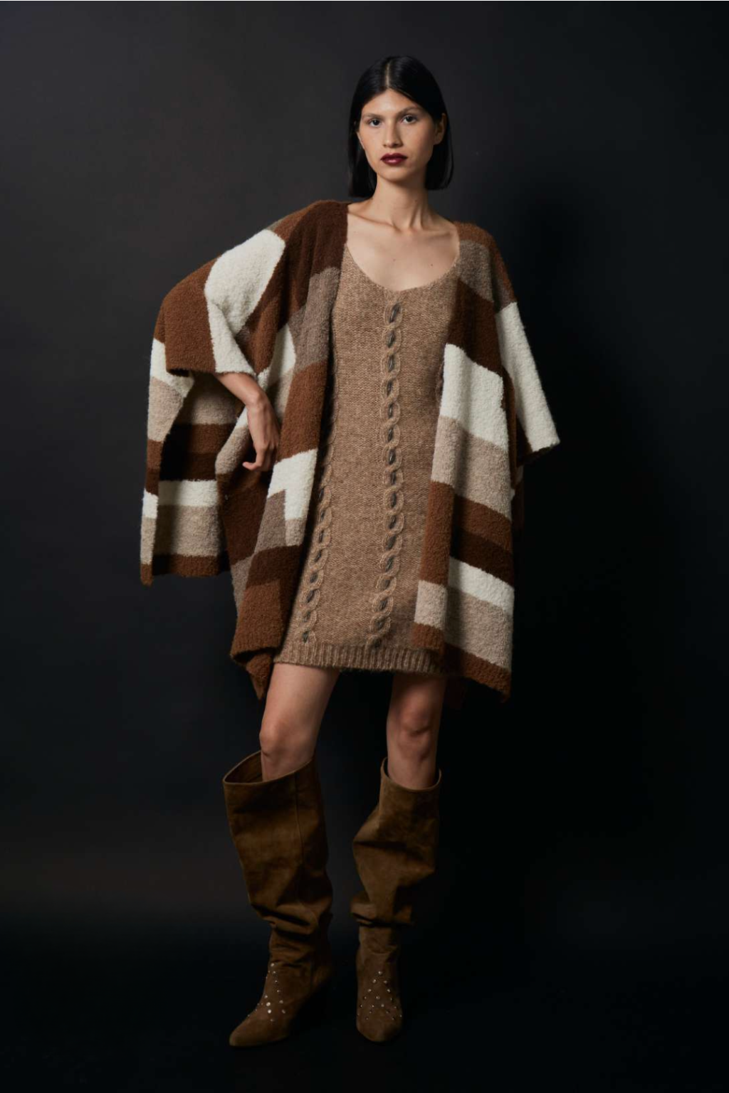 The Dione Poncho is a boucle knit oversized poncho. With it's geometric tonal brown stripe pattern it is a fall statement piece. Woven from alpaca which is known for its unmatched softness and natural warmth.