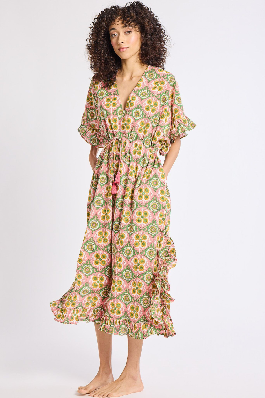 The Eden caftan is a showstopper poolside, at the beach or anywhere your heart desires. Available in one size. Features an adjustable tie waist with tassel detail. V-neck with ruffle trim along hem and sleeve, side slits and pockets. Pullover styling. No stretch.