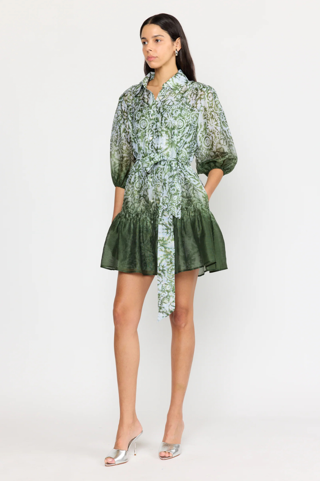 The Erin is Christy Lynn's classic Emi dress reimagined with a dark gradient, perfect for any high Summer occasion. She features puff sleeves with elastic at the cuffs, a feminine ruffled tier at the skirt, and a high-neck collar. The dress closes with Christy Lynn mother-of pearl buttons down the front placket and has a detachable self-tie belt at the waist for enhancement. Complete with a matching stretch slip.