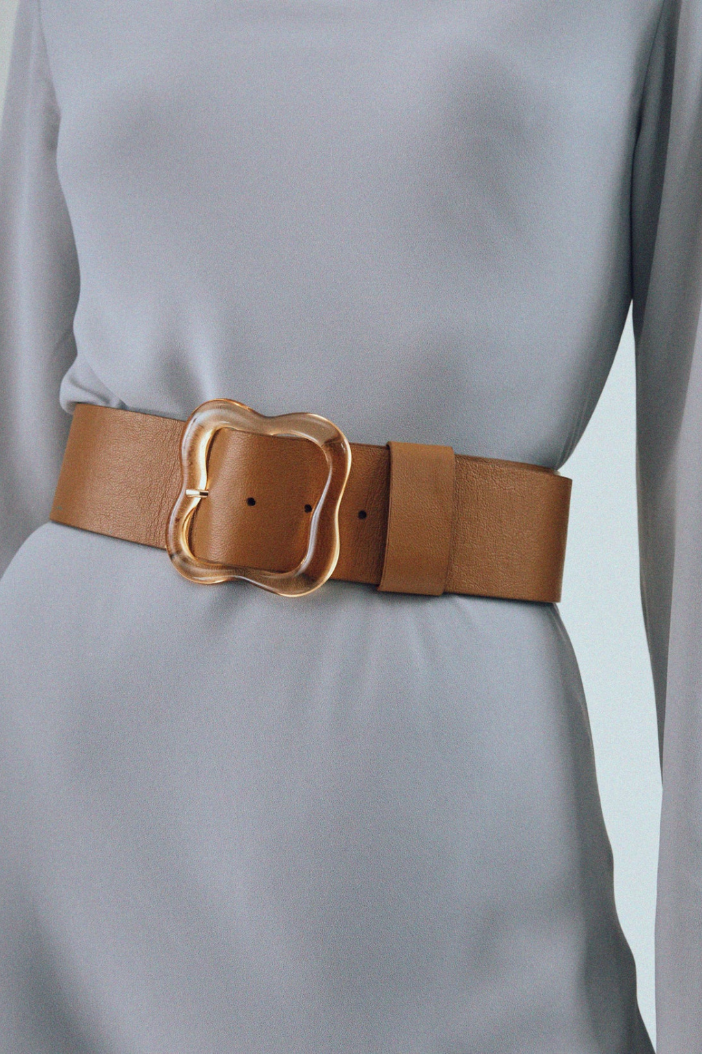 Cinch a trench, pencil skirt, or high-waisted pants with the sleekly chic Florence Belt, in signature amber leather with a clover-inspired buckle in honey-colored resin.