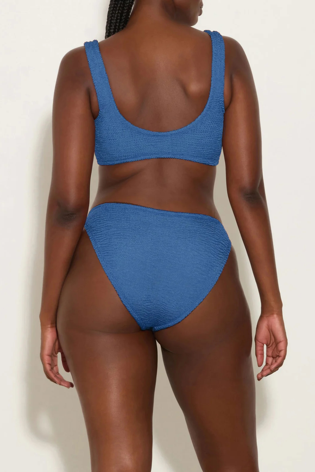 Effortless, modern, minimal. Hallie has understated style to spare with tonal hoop detailing for added style points. Newly reimagined in Hunza's lurex fabrication for a shimmery update. Hunza G.'s ingenious Original Crinkle™ fabric is designed to flex and sculpt to your body, which is why all Hunza G items are made in one size only. Anyone from a US size 2-12 can wear this item comfortably and confidently. Varying styles and shapes may sculpt and accentuate body shapes differently.