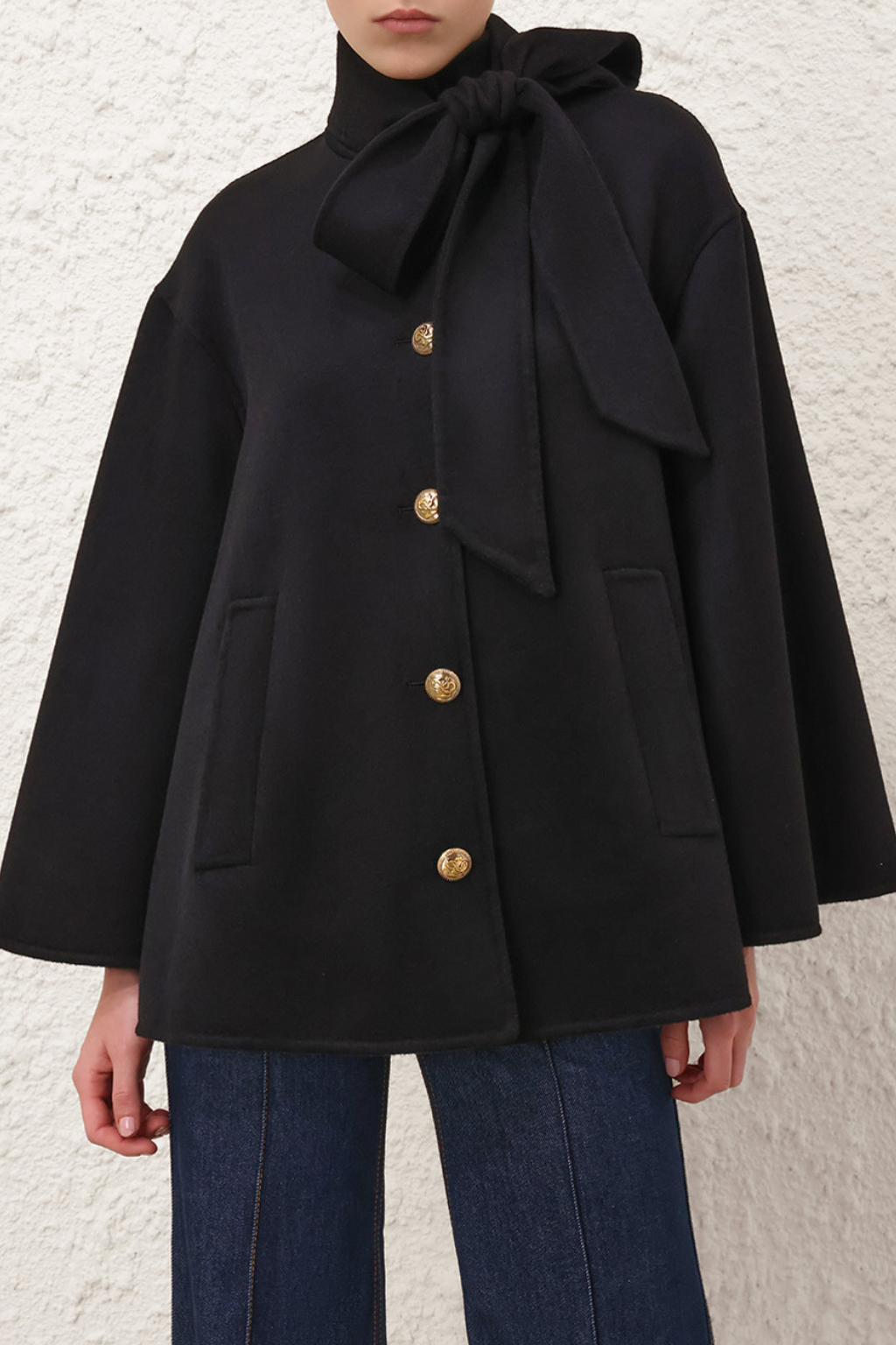 The Hypnotic Pussybow Coat in Black from the Fall 2025 Collection, Hypnotic. A double faced wool blend coat featuring a stand collar with removable pussybow necktie, wide sleeves and gold military style buttons down the center front. With a swingy silhouette and functional side pockets this coat will surely put a spring in your step.