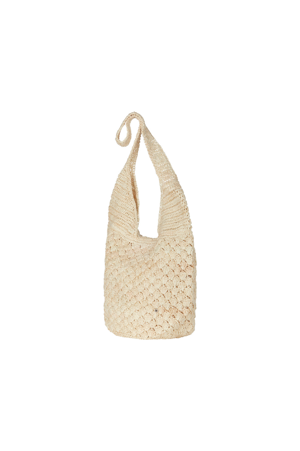 Shell stitch raffia hobo bag is fully lined in canvas with an interior pocket for convenient storage and a magnetic snap closure for added security. Crafted for both style and functionality.
