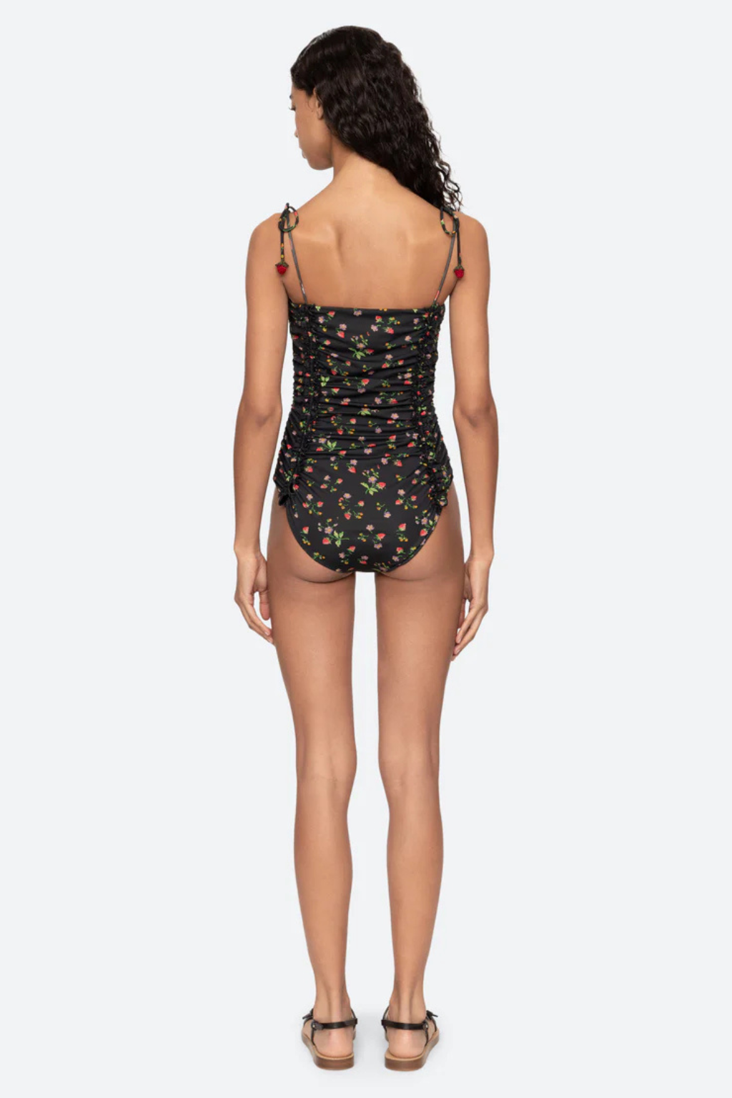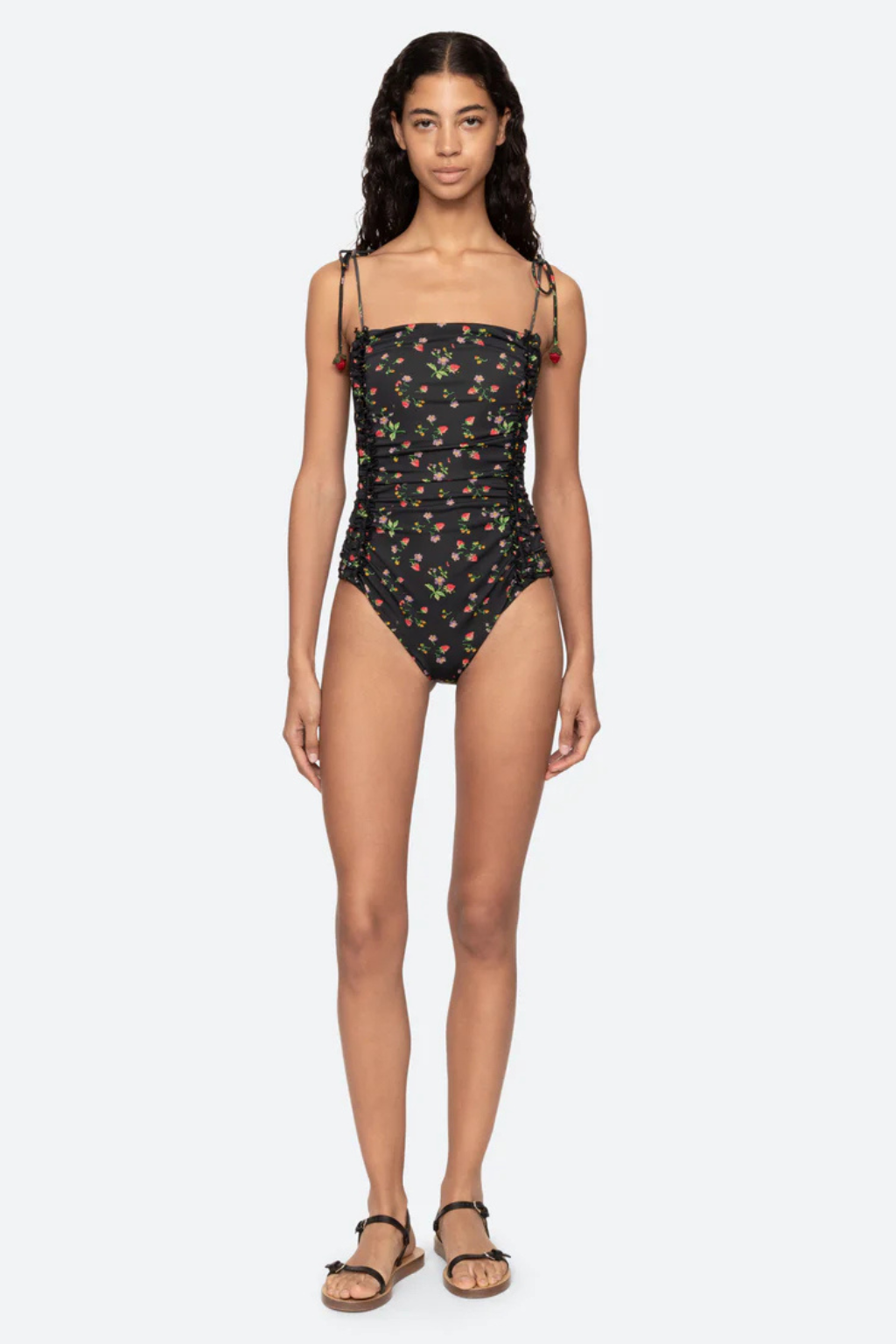 The Katarina fruit print one piece features ruffle and ruched detailing, adjustable straps, and playful crochet strawberries at the end of the ties. Its whimsical accents and flattering silhouette make it a fun, resort-ready style.