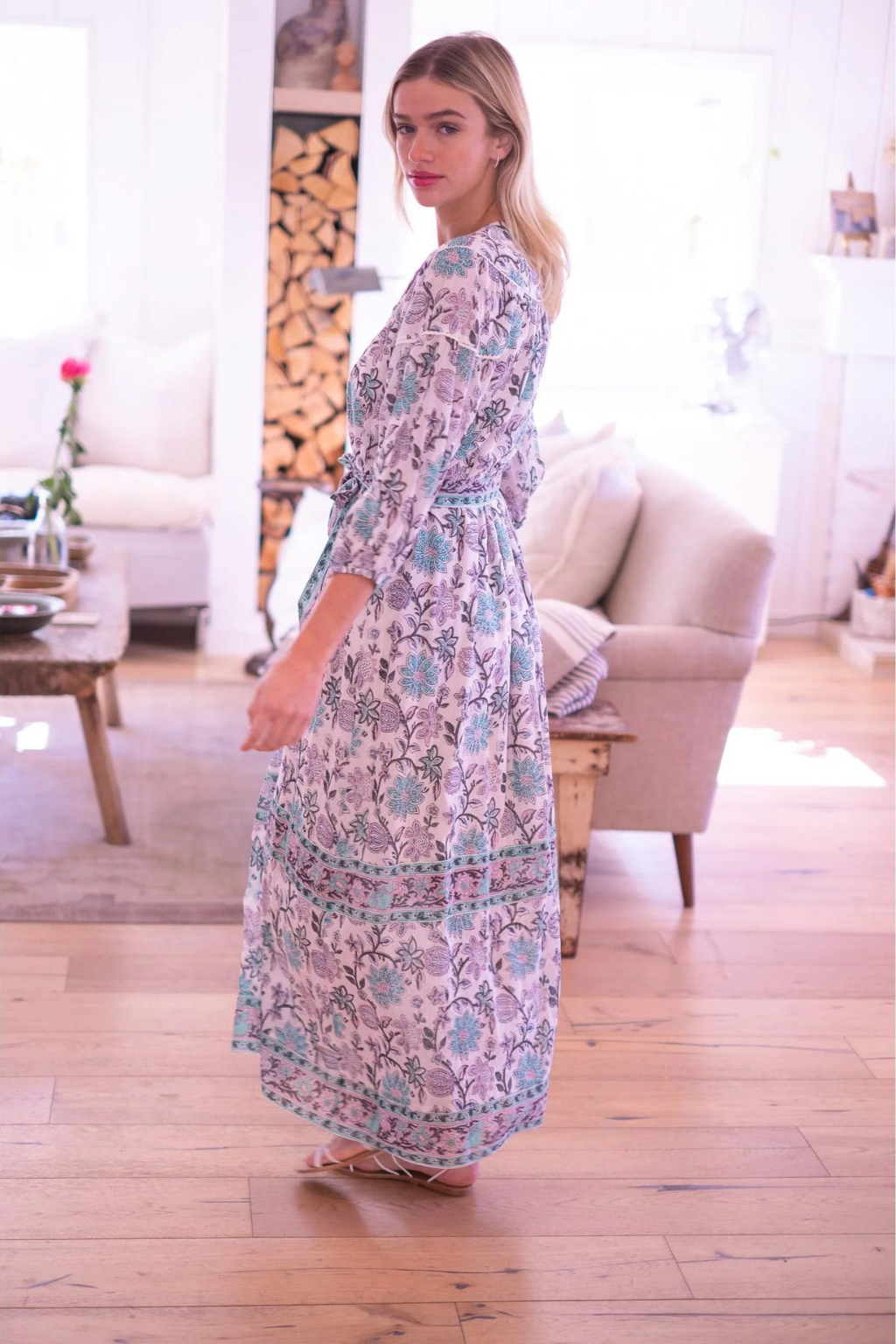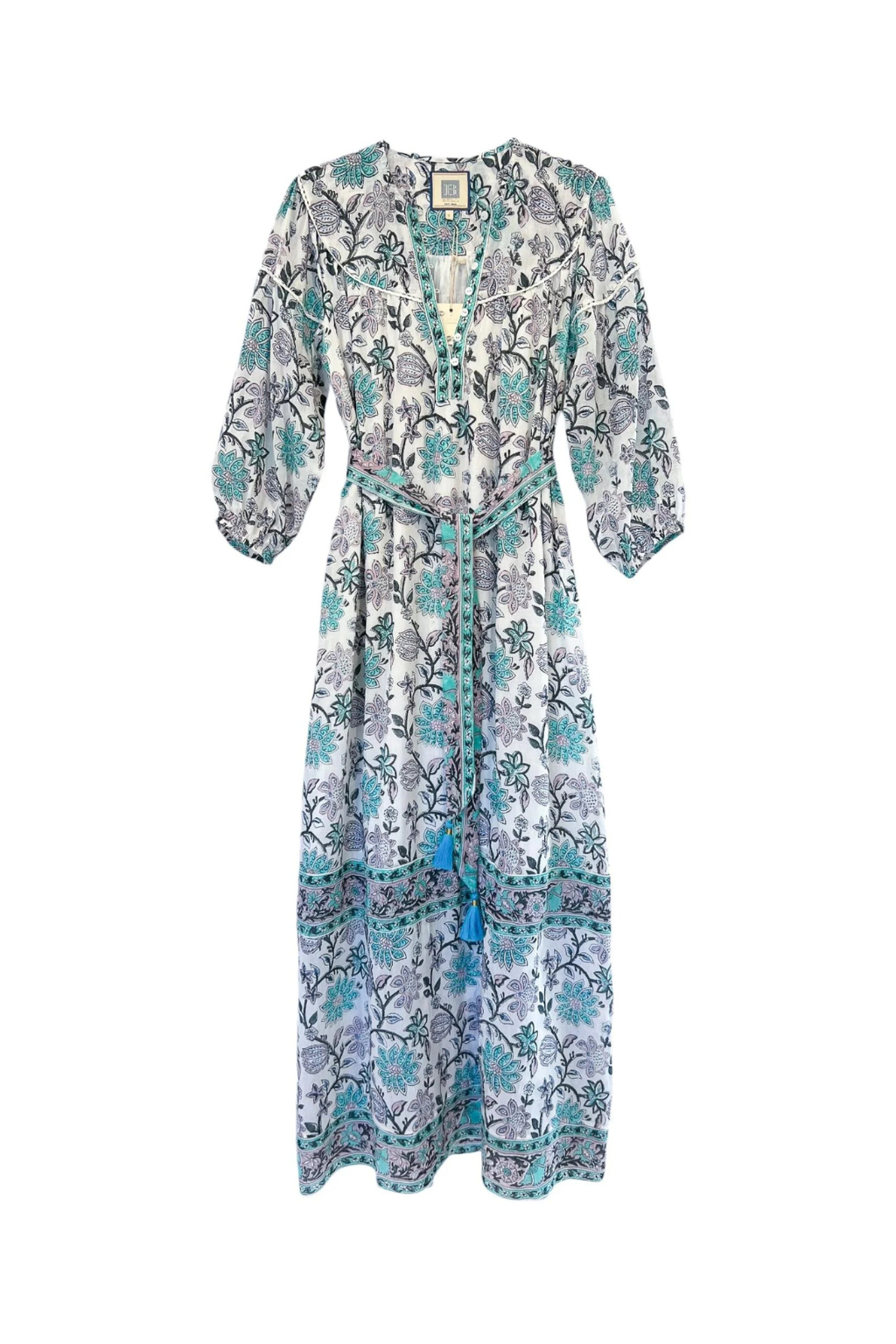 Silk cotton voile hand blocked long sleeve maxi dress with button up detailing and tassel tie waist.