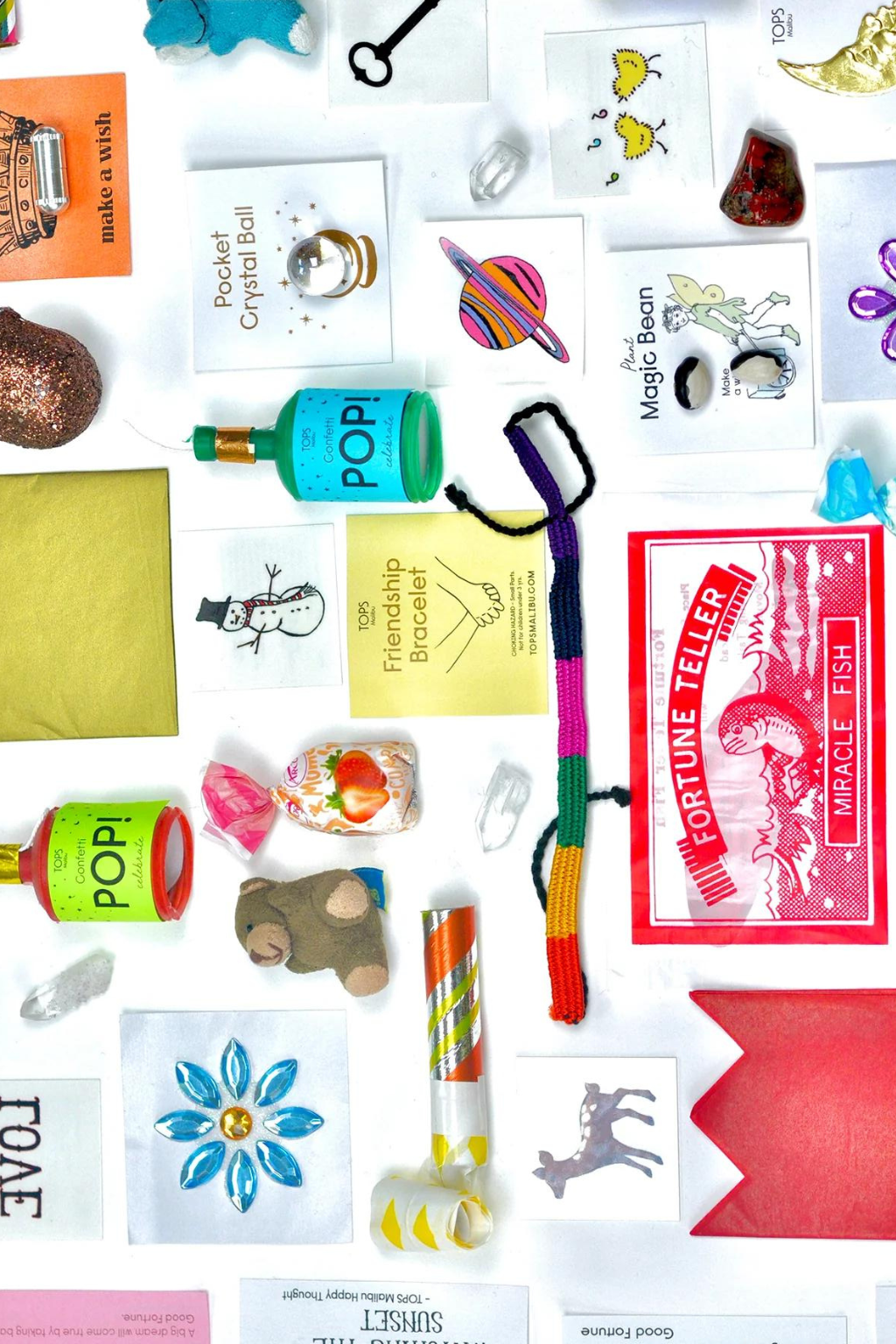 Surprises vary by style and may include: gemstone or crystal, vintage-inspired toy, charm, sweet, crown, temporary tattoo, confetti popper, your good fortune and more.