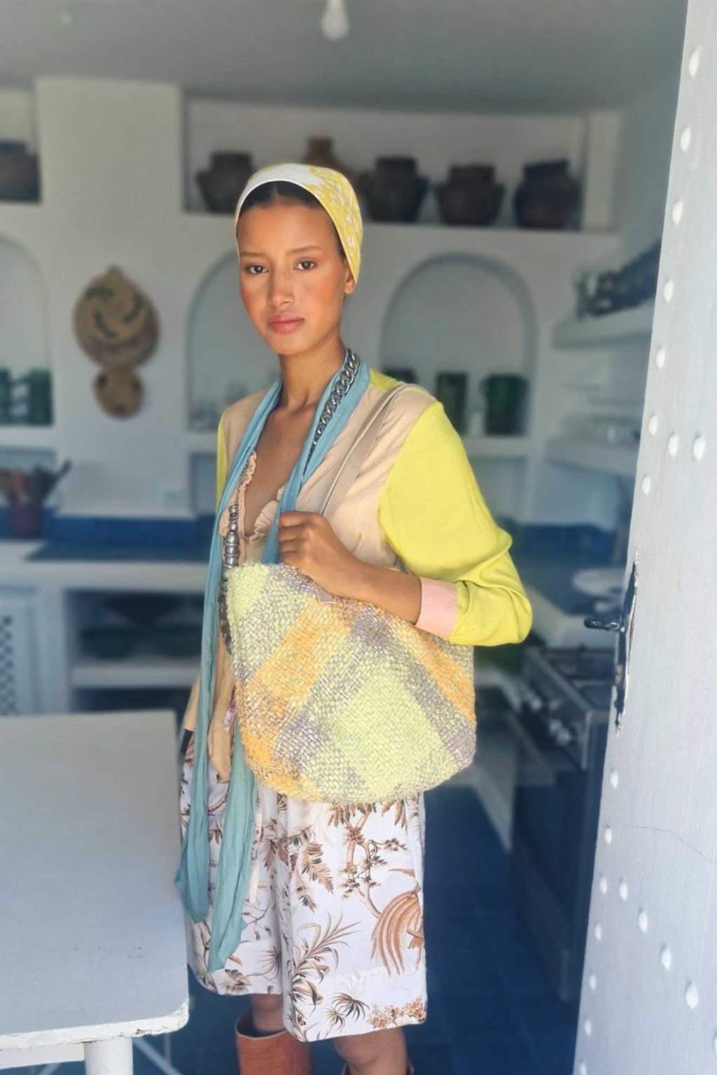 This tote is handwoven in multicolored facric strips with a striped canvas interior. It features sturdy leather straps and a lined interior. Inside, you'll find a slotted accessories pocket, zip pocket, and magnetic snap closure. Perfect for all your essentials while making a splash.