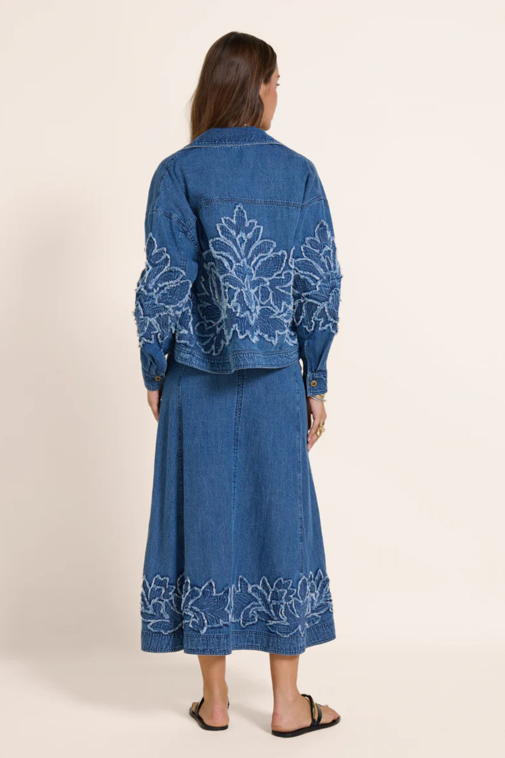 The refined LIVIA SKIRT in denim, a timeless midi-length piece designed to flatter with its high waist and A line silhouette. The full front opening, fastened by antique brass buttons, adds a vintage charm to this modern skirt.
