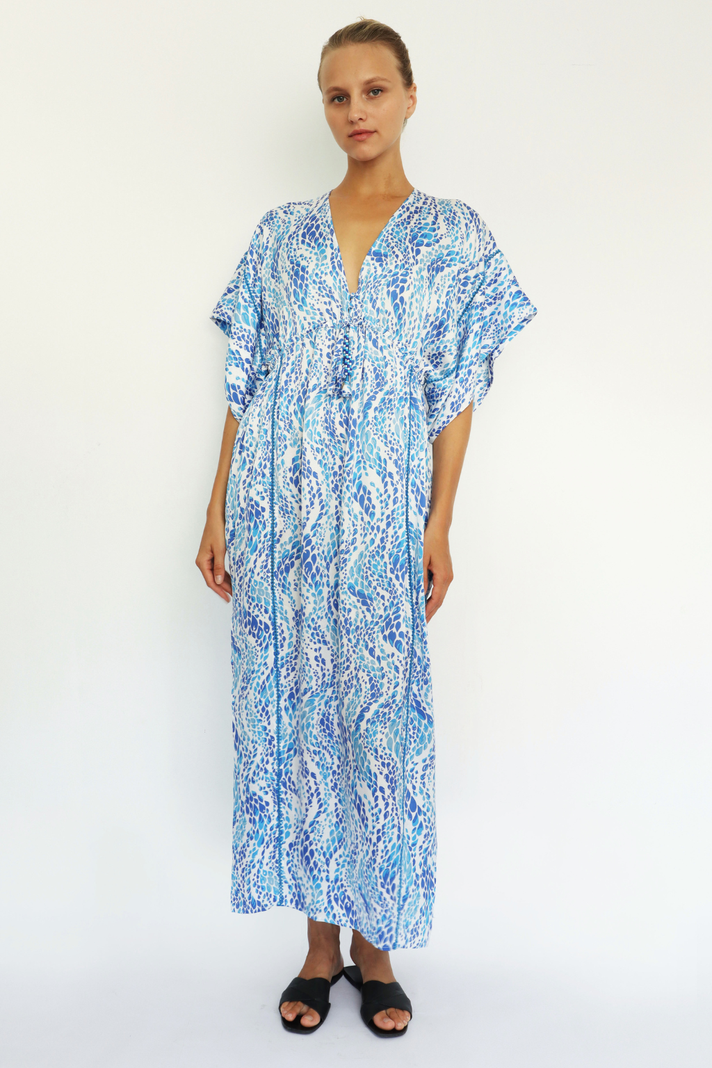 The Long Kaftan Amaya by Poupette St Barth reflects relaxed and sophisticated elegance. Its V-neckline highlights the neckline, while the cinched waist with a drawstring ensures a flattering and perfect fit. Wide slits on each side add airy fluidity, ideal for graceful movement, and its wide sleeves enhance its lightness.