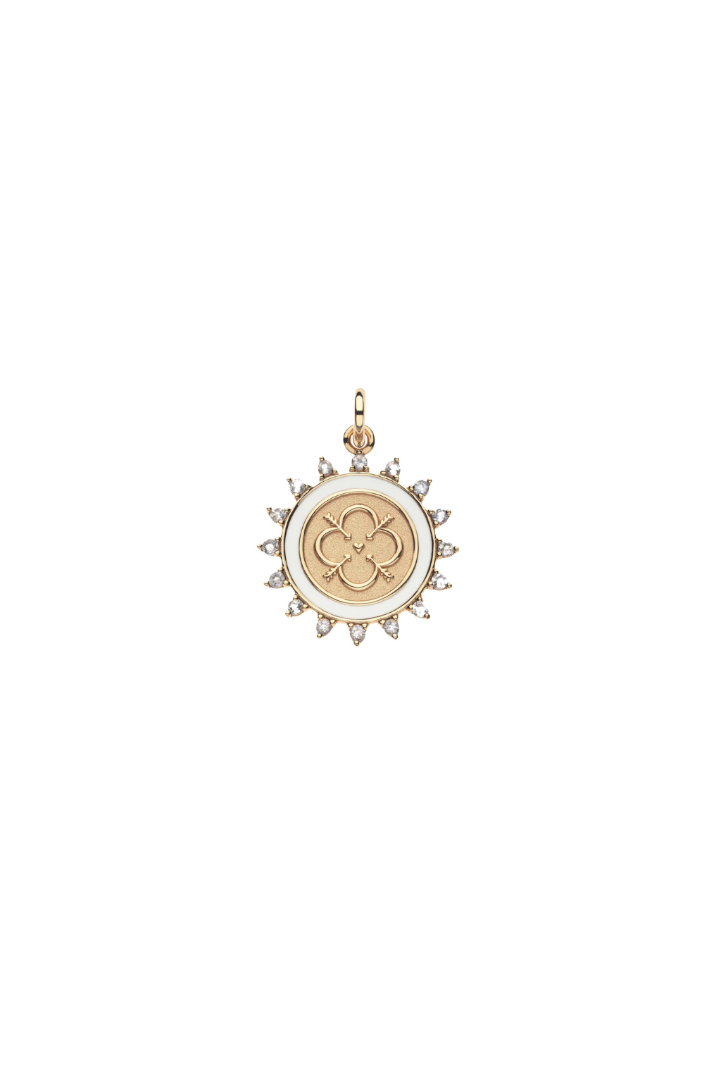 This is a limited edition version of the Original Love Coin, made in a smaller size and accented with White Enamel and Rainbow Moonstones.