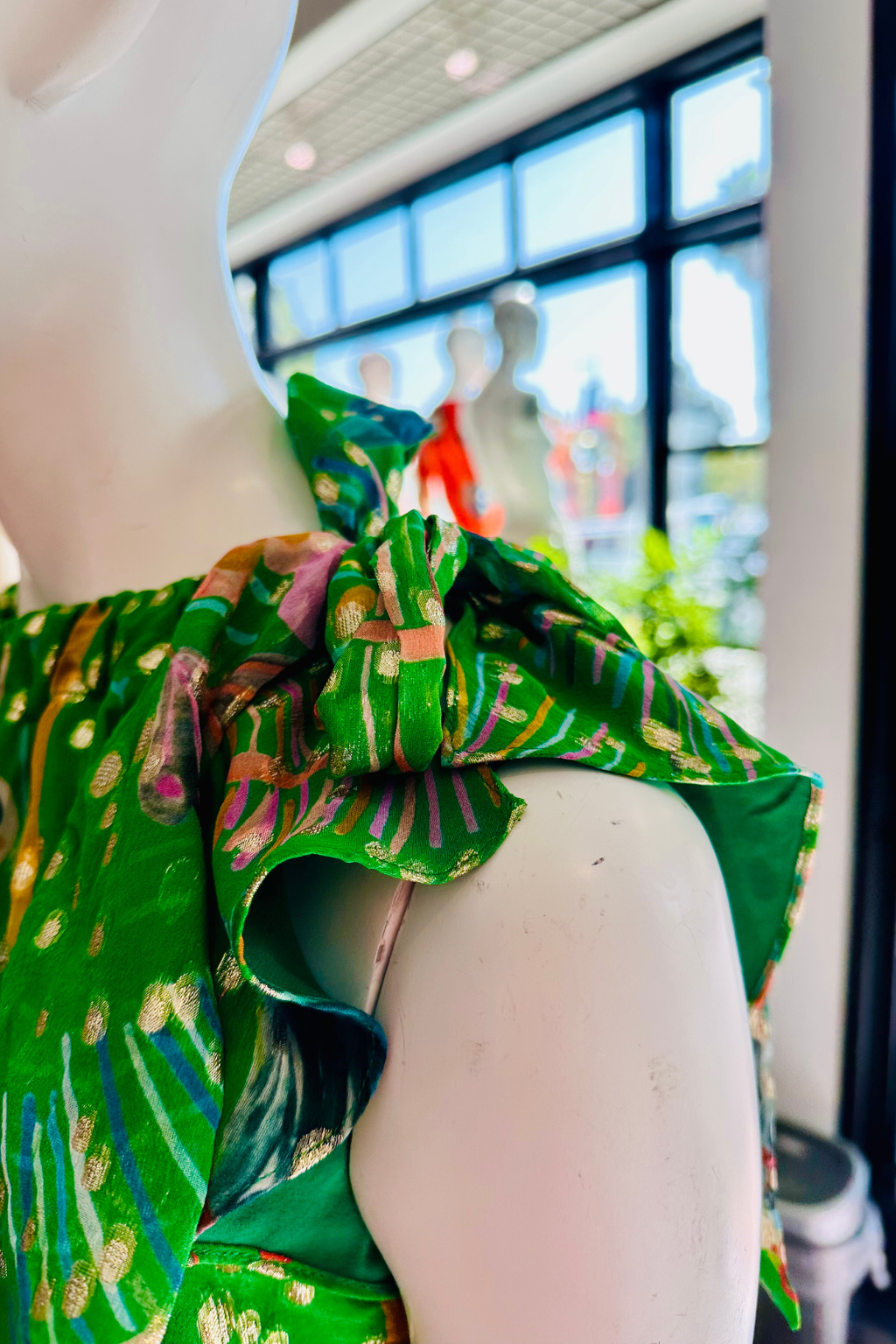 Elasticated round neck with side tie and pretty open sleeve. Gathered tiered midi skirt with elasticated waist. Fully lined with French seams. Matching sash belt. Exclusive to Permanent Vacation.