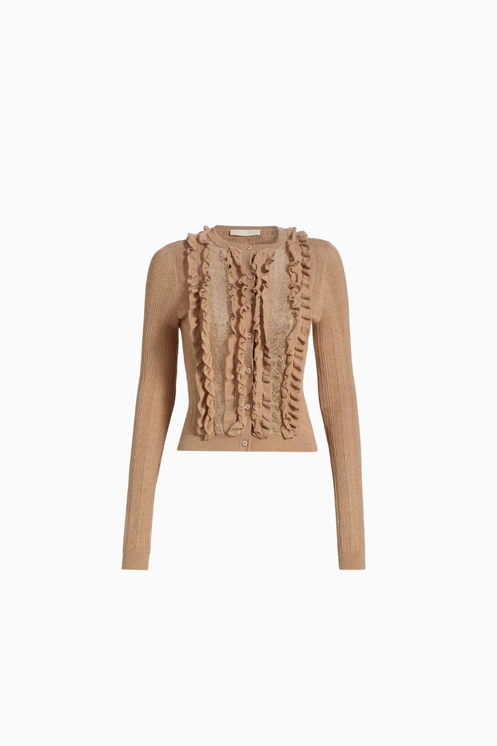 Arriving in Look 20 on the AW25 runway, the Maryel Cardigan is a confection of dancing ruffles and delicate lace in soft merino wool. This beige cardigan features a softly ribbed texture and is equally elegant worn solo or layered over the Anthia Cami. Designed for a close fit.