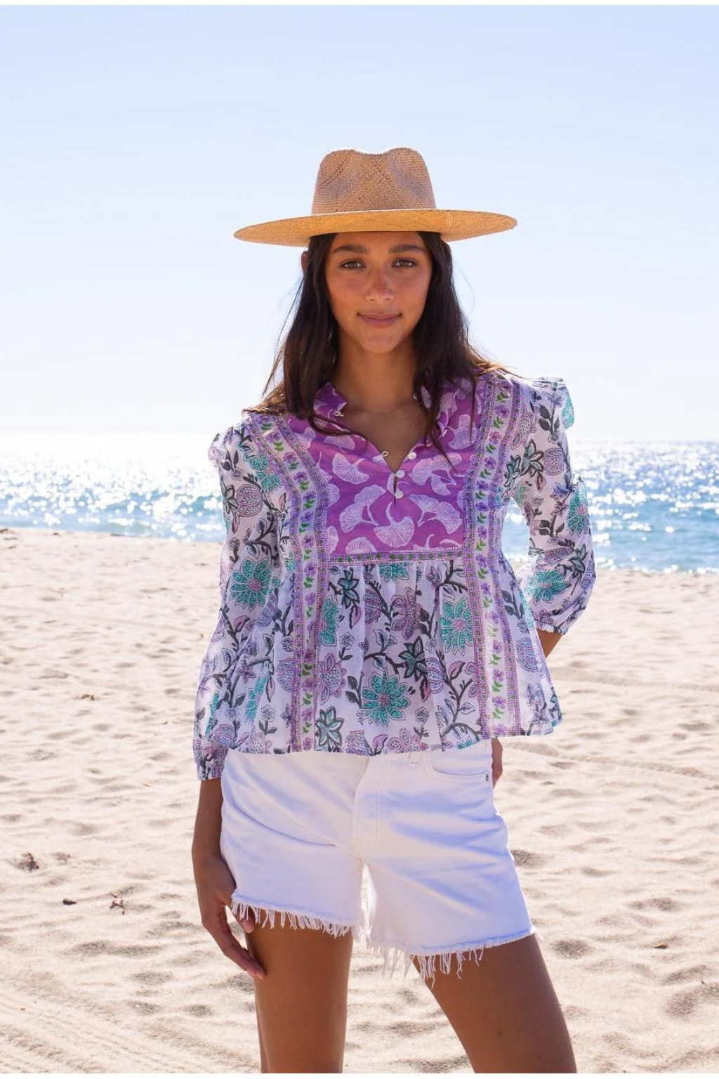 Silk cotton voile hand blocked top with long balloon sleeves, contrast yoke and button up detailing.