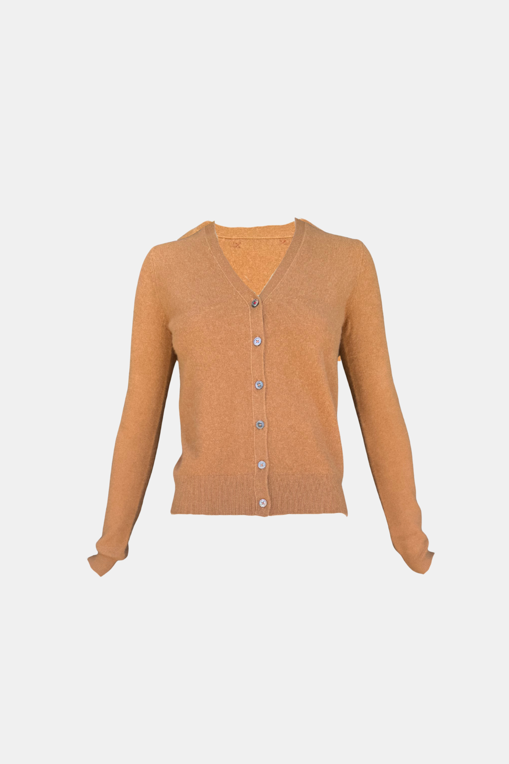 Classic cashmere v-neck cardigan with a slightly shrunken fit to give it a modern look. It is a great item on its own or we love it with the matching blouse and skirt.