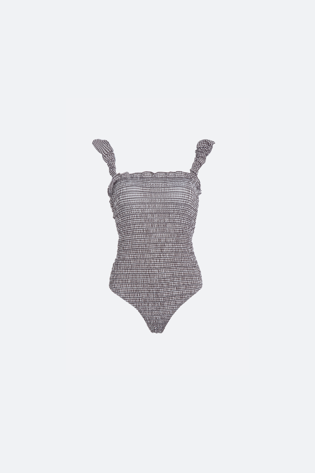 The Neci Gingham smocked one piece swimsuit features flattering smocking throughout and ruffle straps.