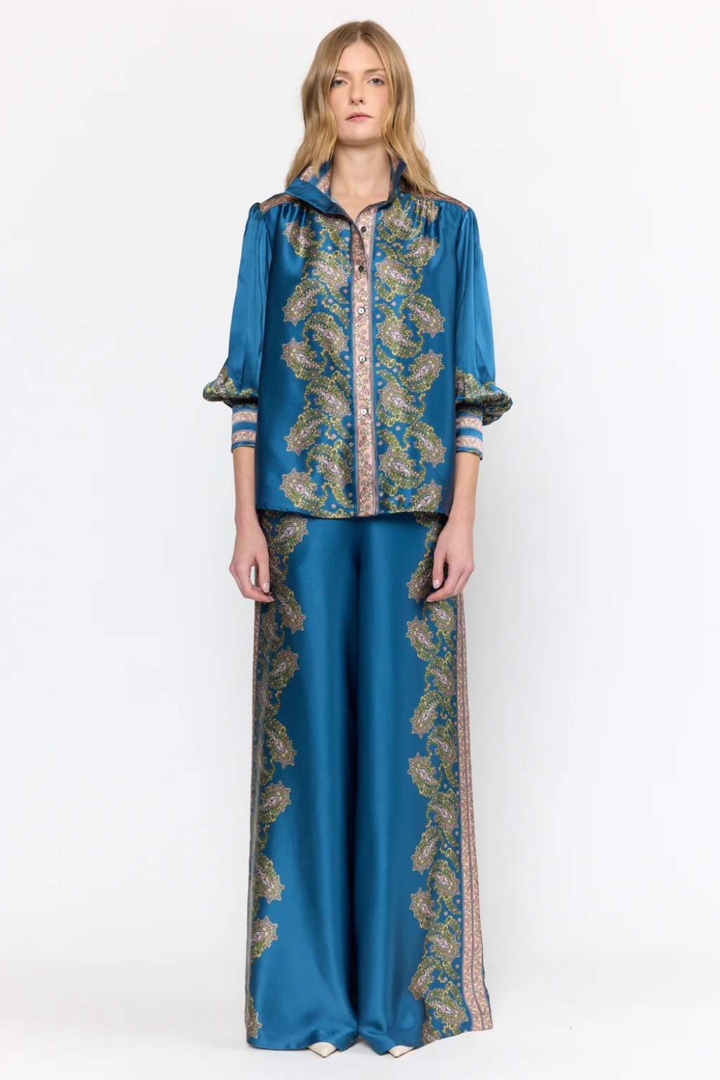The Paloma Top in Prussian Paisley features a thoughtfully placed print with slight bishop sleeves that gather elegantly at the cuffs. Its simple yet sophisticated collar complements the button-up placket running down the center, offering a polished and timeless look suitable for formal settings.