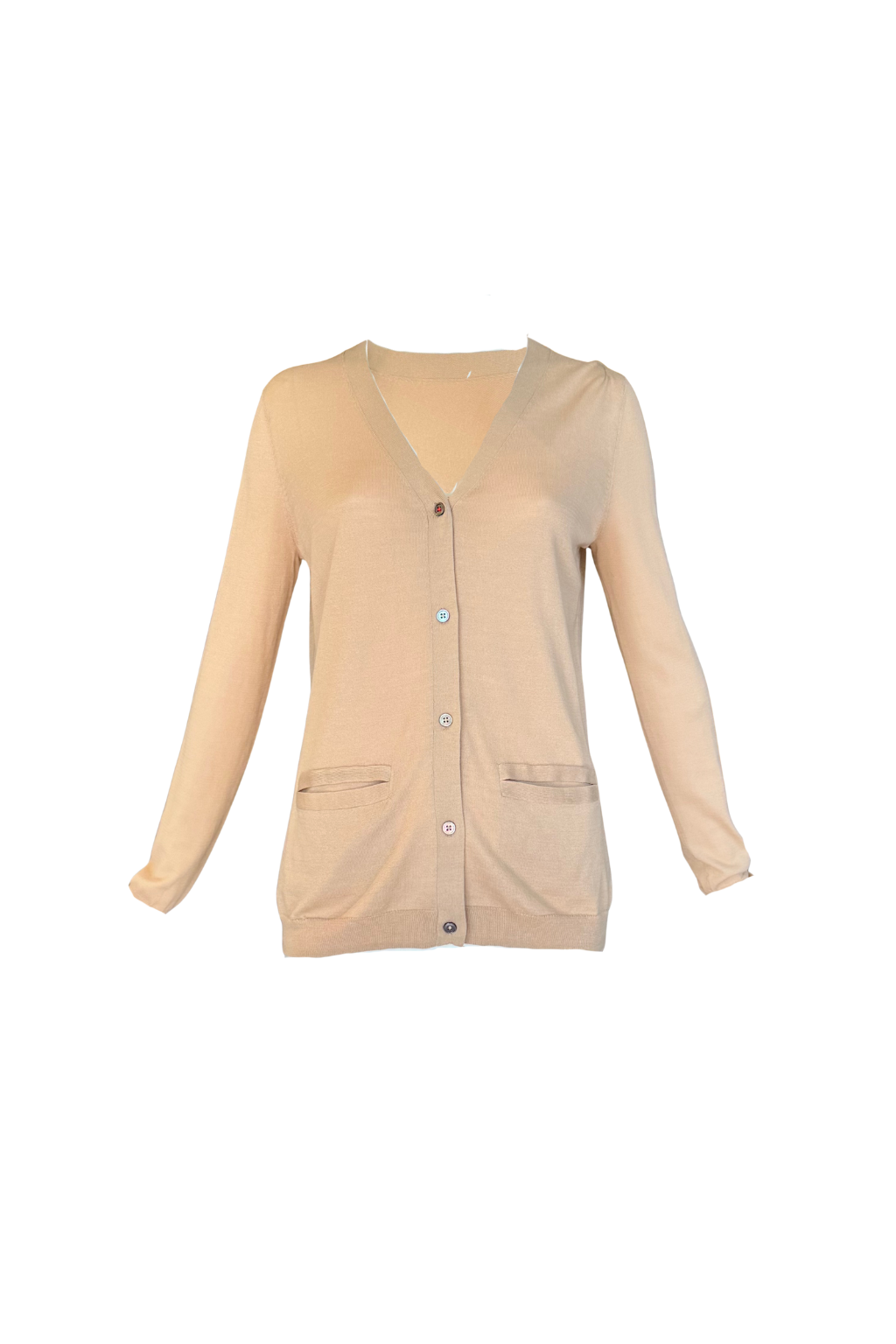 Paper weight pima cotton v-neck five button cardigan with welt pockets. The perfect thing to keep your shoulders from getting cold on those chilly summer nights.