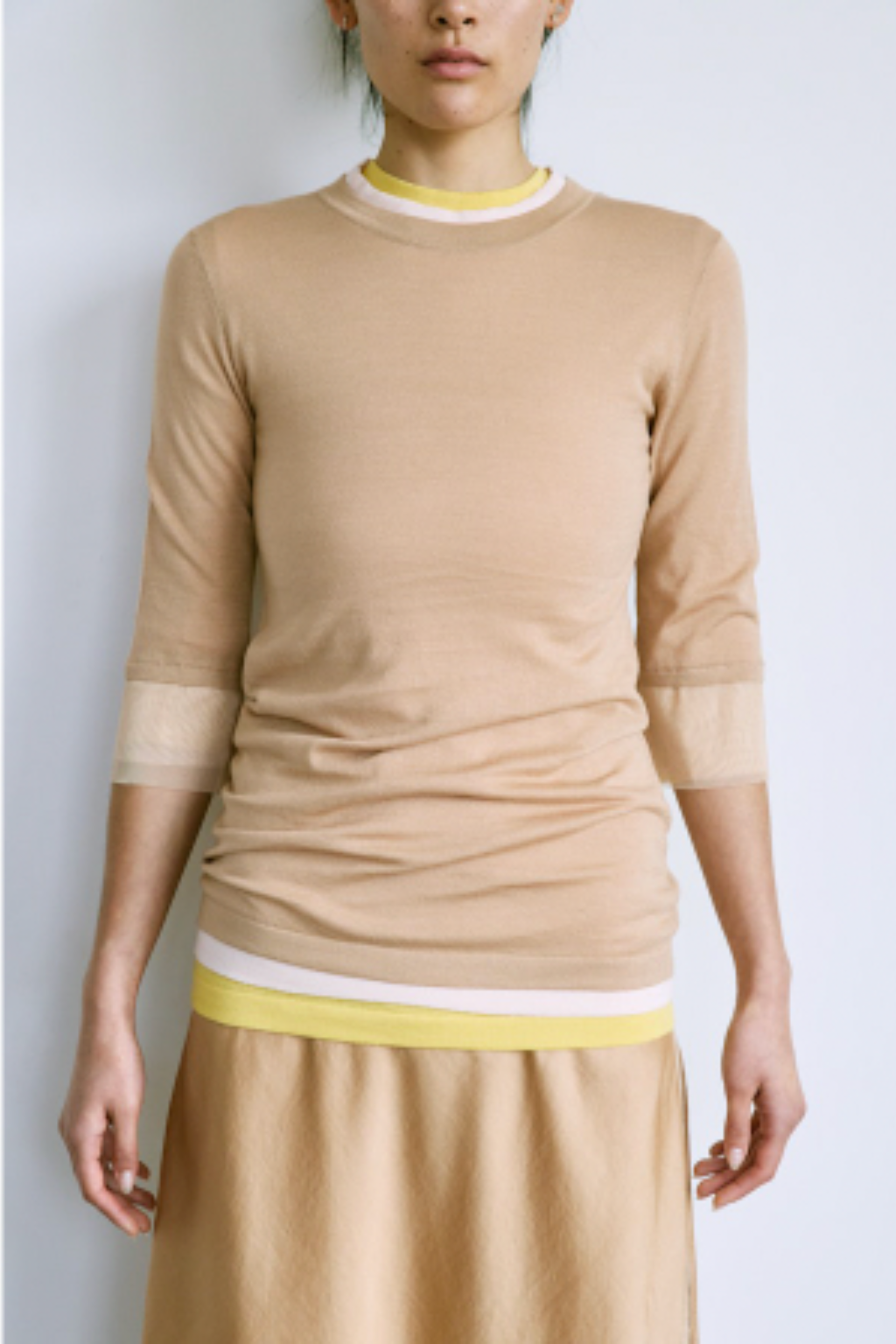 Paper weight pima cotton sweater with three quarter sleeves and tulle detail at cuff.