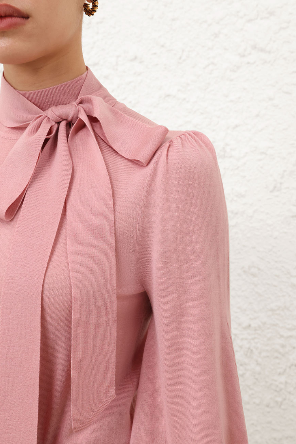 The Hypnotic Pussybow Coat in Black from the Fall 2025 Collection, Hypnotic. A double faced wool blend coat featuring a stand collar with removable pussybow necktie, wide sleeves and gold military style buttons down the center front. With a swingy silhouette and functional side pockets this coat will surely put a spring in your step.