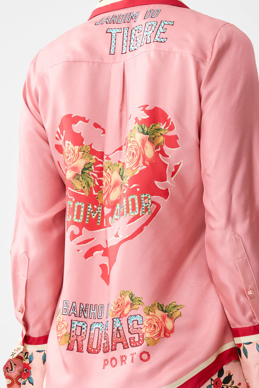 Designed in Australia, the Pink Porto Pyjama Shirt refines blossoming romance, floral gardens dance along pastel pink mosaics kissed with red touches. Lovingly handcrafted, this CAMILLA silk pyjama shirt is a complimentary slim fit throughout the body which falls to a hip-length hemline. The relaxed long sleeves feature wide split cuffs that drape beautifully across the wrist.