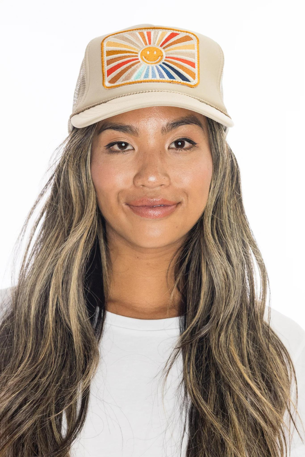 Find your 'Friday Happy' no matter what day it is! A hat to look and feel good in! A comfortable foam front, mesh back, high crown trucker hat featuring an adjustable snap-back.