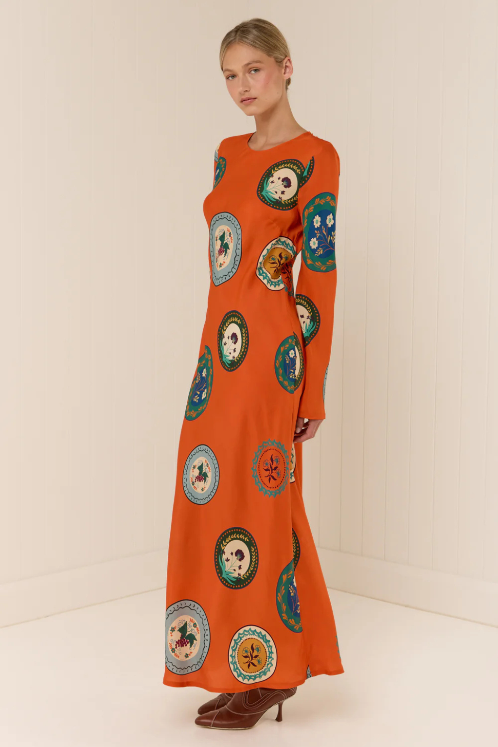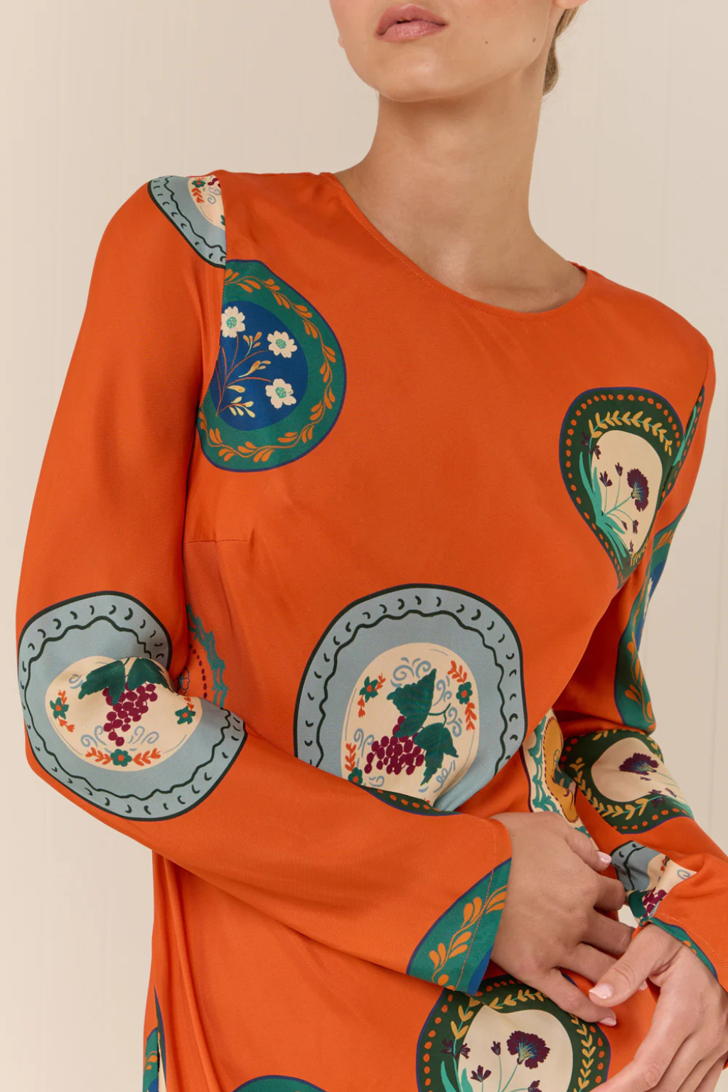 The Roma Dress, printed in the exclusive Orange Plates print, is crafted from a premium Lyocell blend. Cut on the Bias, the Roma Dress is designed to softly skim the body for a flattering fit. Featuring a rounded high neckline, flared sleeves and an ankle length hem.