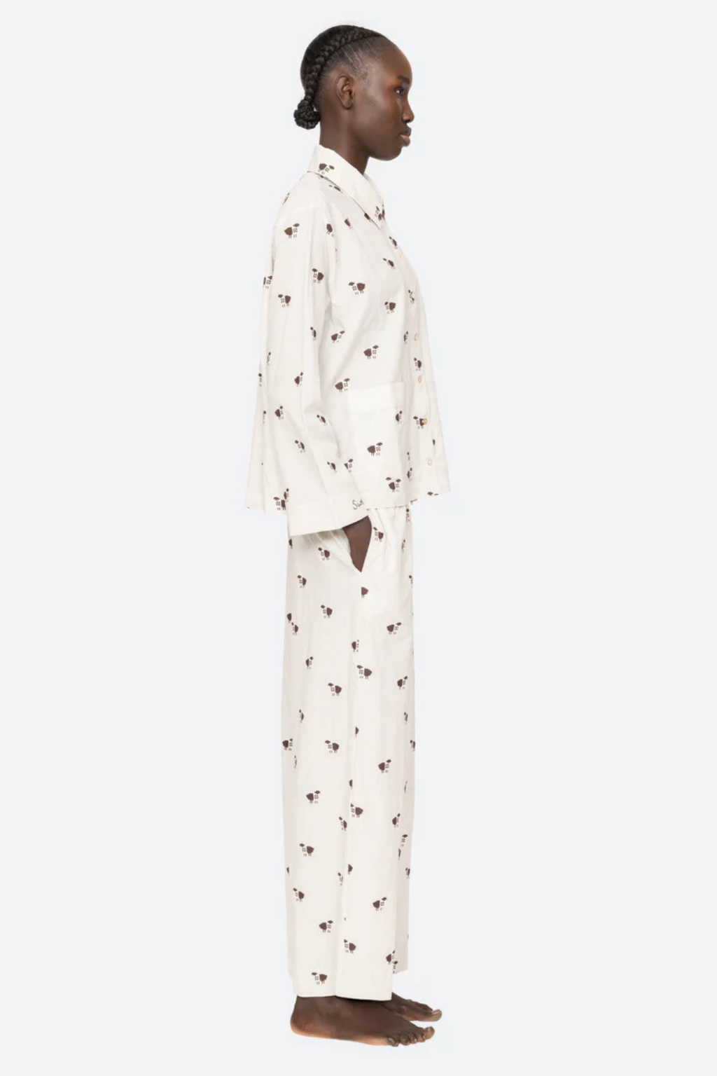 The Ruthie pajama set is crafted from striped fabric, adorned with charming embroidered sheep accents throughout. "Sweet Dreams" embroidery on the cuffs adds a whimsical, playful detail to this sleepwear set. Featuring a button front top and and elasticized waist pant with side seam pockets the Ruthie is designed for a relaxed fit.