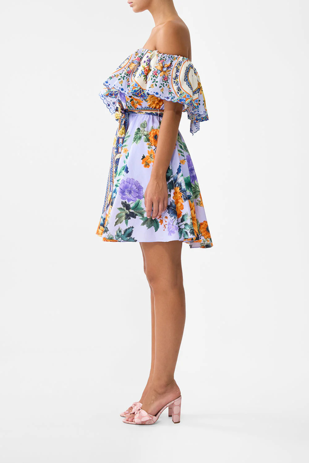 Designed in Australia, the Luscious In Lisbon Shoulder Frill Short Dress renders tiles as stories - orange florals bloom upon a lavender haze, a canvas of vibrant ceramic artistry that echoes a timeless imagination. Lovingly handcrafted, this luxury off-the-shoulder mini dress features a slightly blousy bodice that cinches into an elastic encased waist and tie. The skirt falls effortlessly at mid-thigh level, and the off-shoulder neckline is adorned with frill detail.