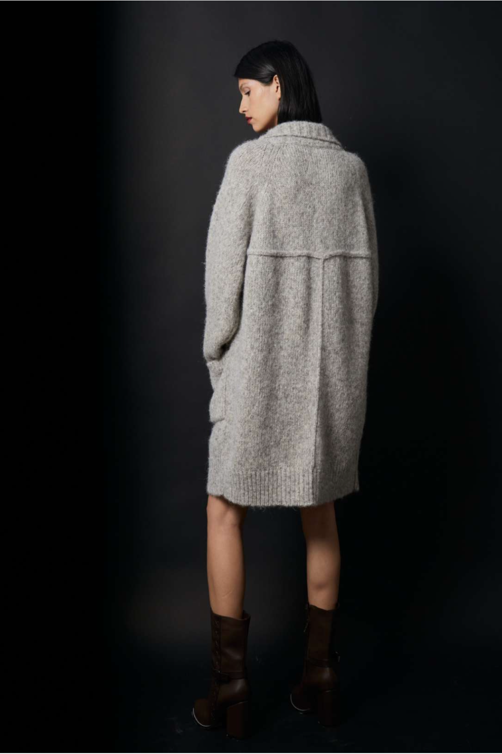 The Sigrid Cardigan is a heavy gauge long cardigan with a notch style lapel collar and patch pockets. Rib trims and an exposed yoke and center back seam give it extra character. Woven from a blend of alpaca known for its unmatched softness and natural warmth and pima cotton which provides extra softness, durability, and is hypoallergenic.