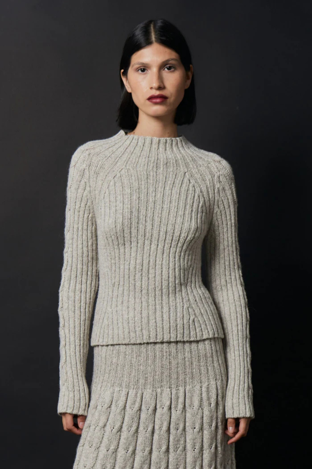 The Solange Sweater is a wide rib mock neck pullover with cable pattern running down each sleeve. Multi colored stitching at the neck and armhole give it a little fun flare. Woven from a blend of alpaca known for its unmatched softness and natural warmth and pima cotton which provides extra softness, durability, and is hypoallergenic.