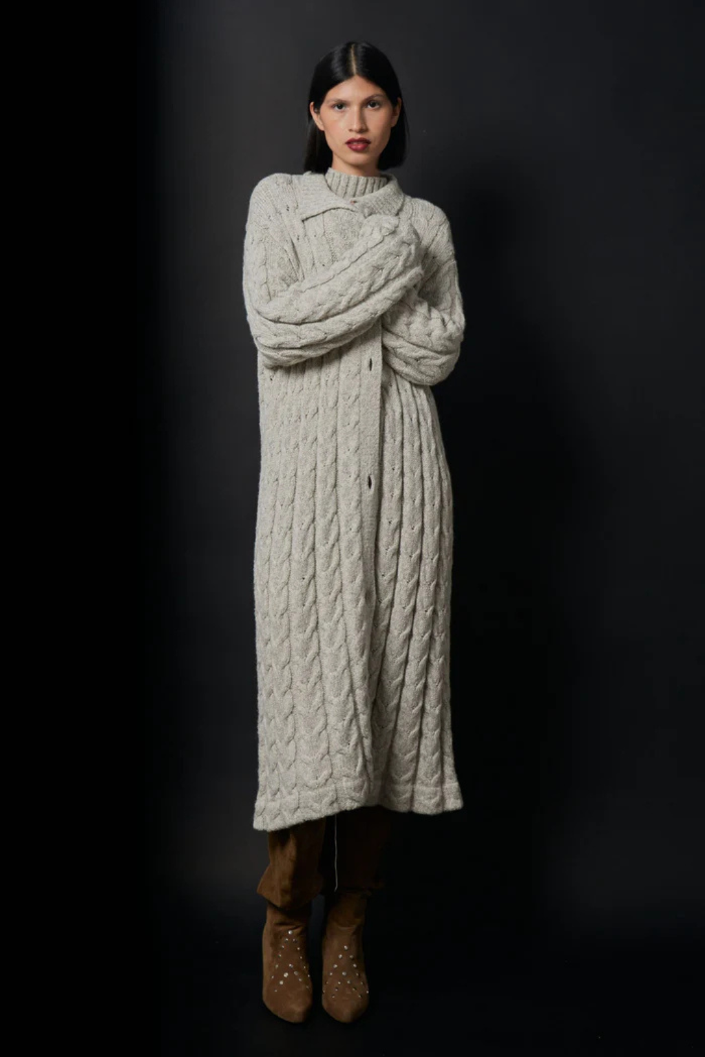 The Steph Cardigan is a maxi length cardigan with cable pattern and a flat collar. Woven from a blend of alpaca known for its unmatched softness and natural warmth and pima cotton which provides extra softness, durability, and is hypoallergenic.