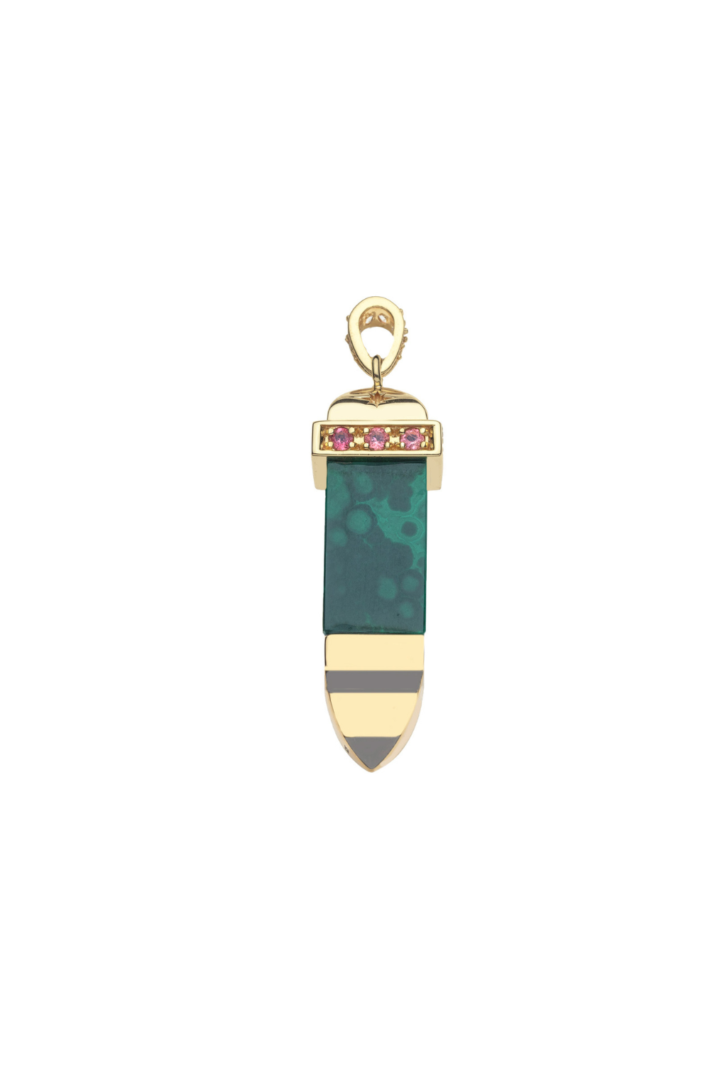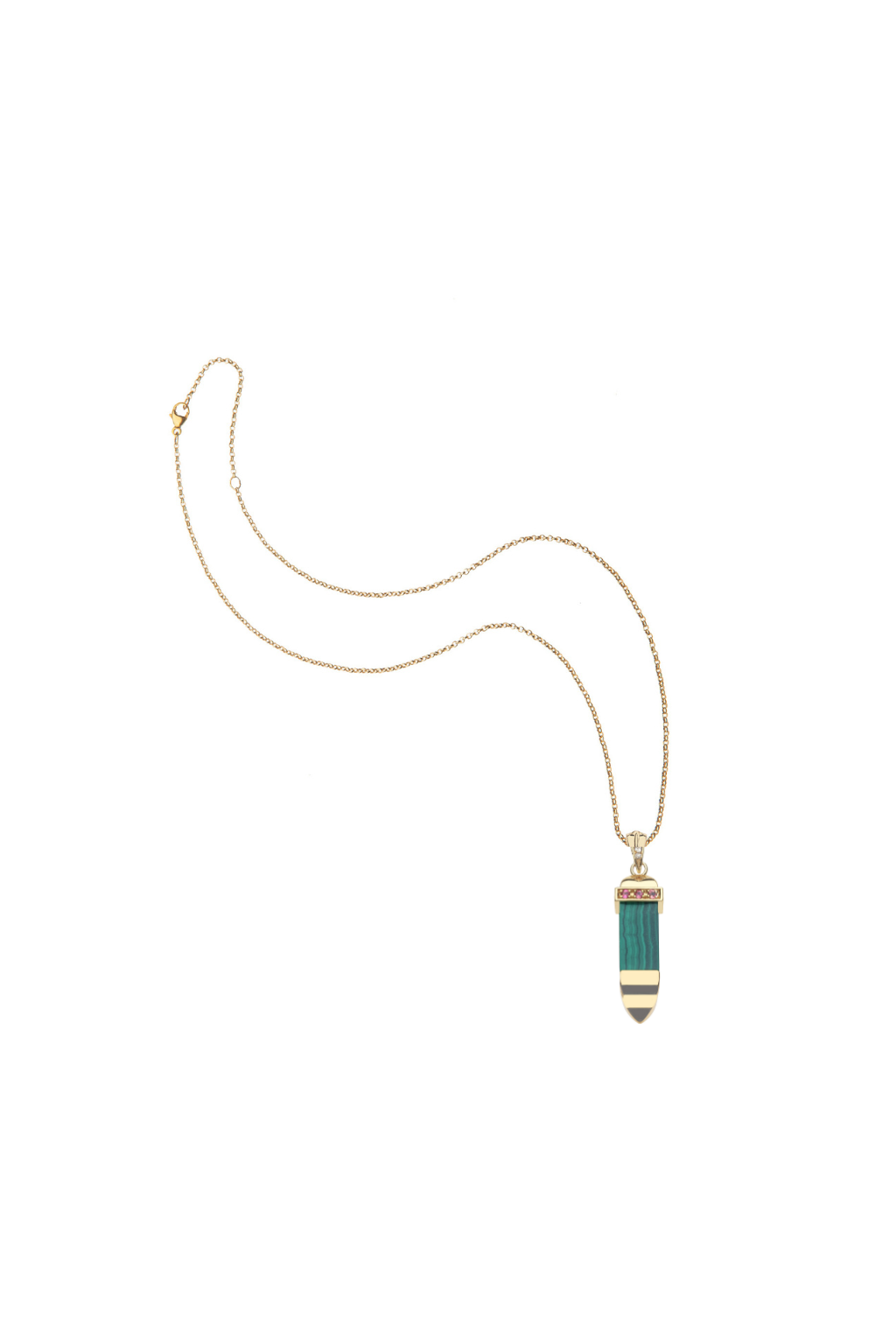 The Sun - the ultimate guiding star. The sun has been a symbol of life and strength in many cultures throughout history, so we encompassed the energy from its rays and grounded it with malachite in this pendant. Embellished with pink topaz stones that catch the light, this pendant is sure to grant you the strength to face any challenge, and the good fortune to guide you toward brighter days.