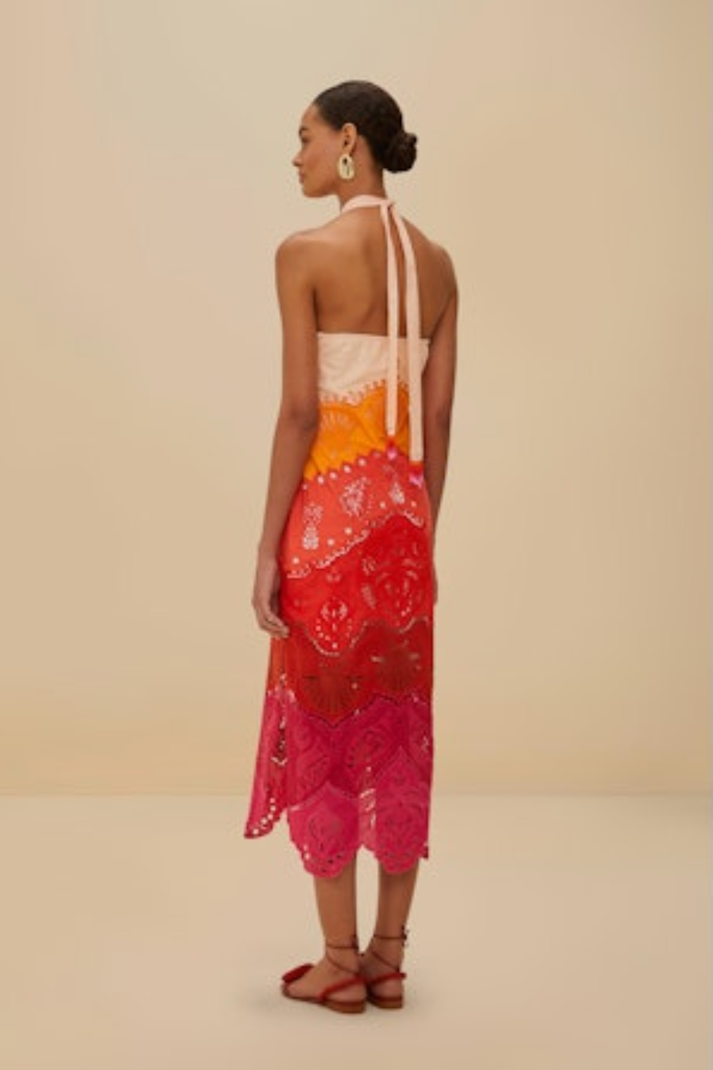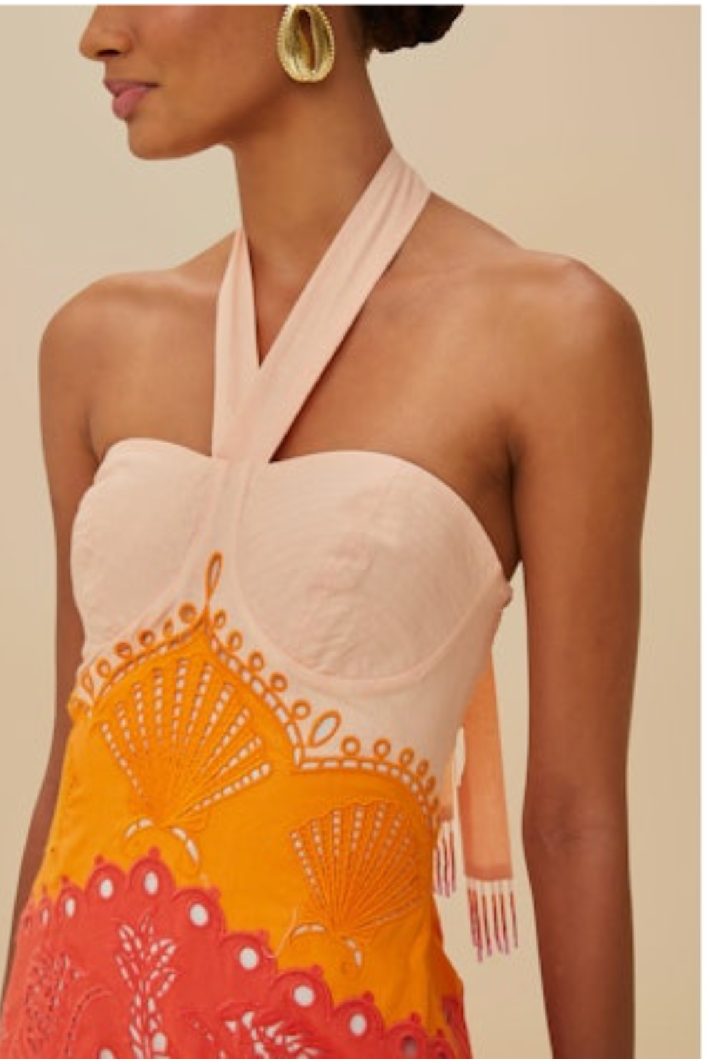This midi dress is sure to make a statement with its playful tie neck halter and unique ombre effect. The seashell themed richelieu embroidered paneling adds an extra level of distinction.