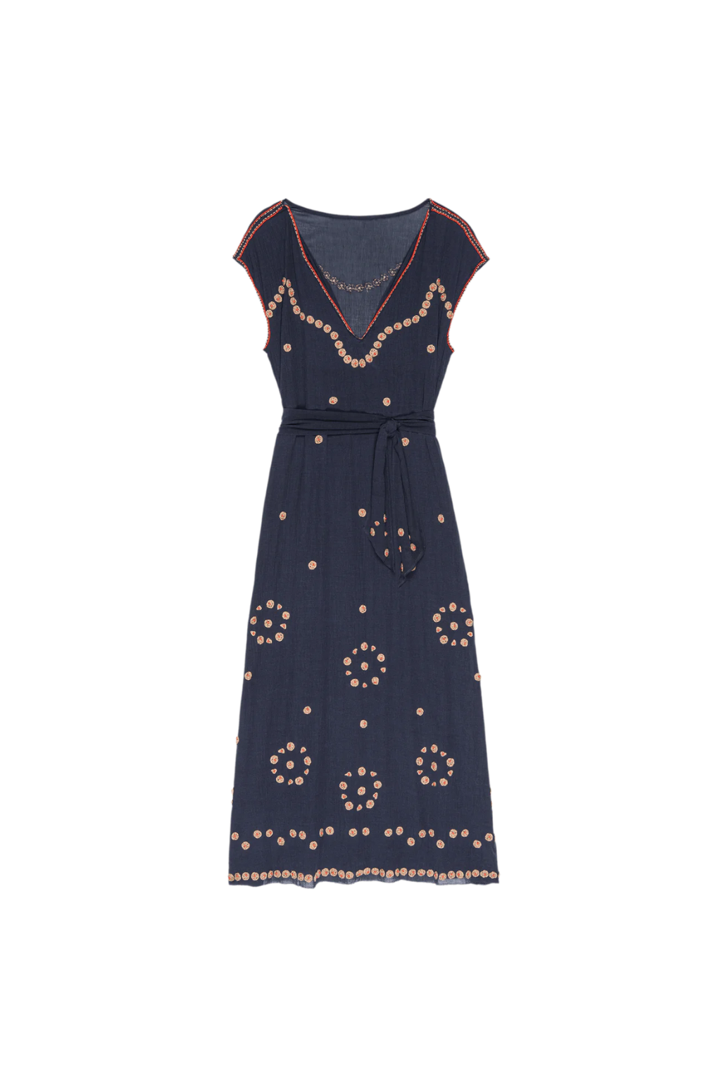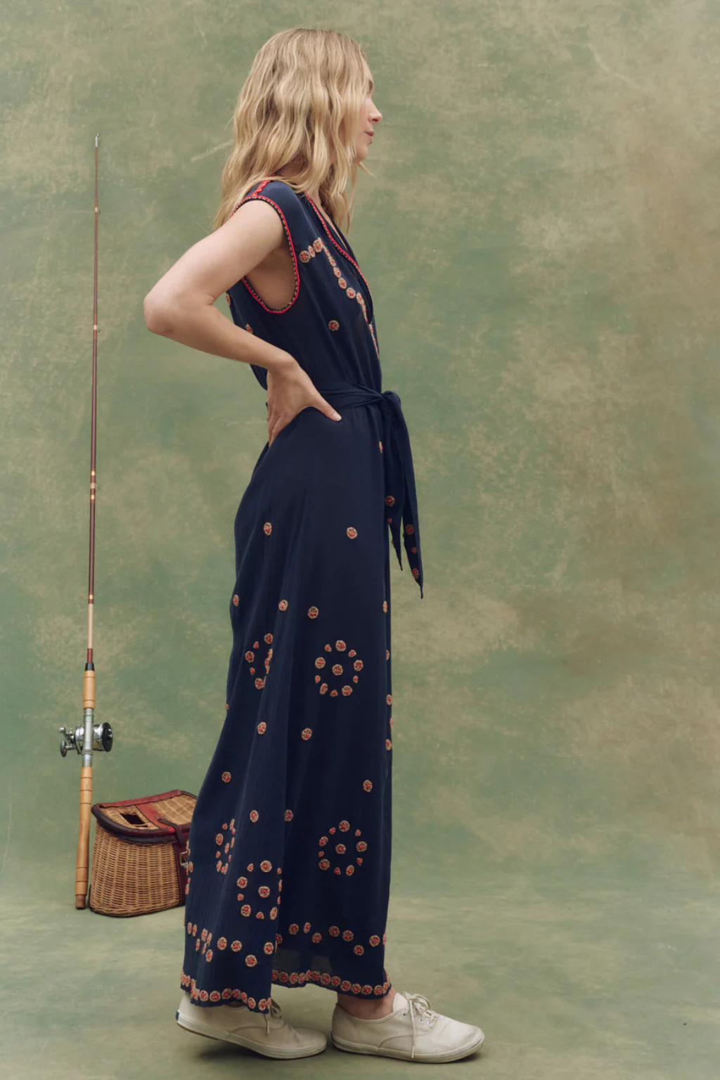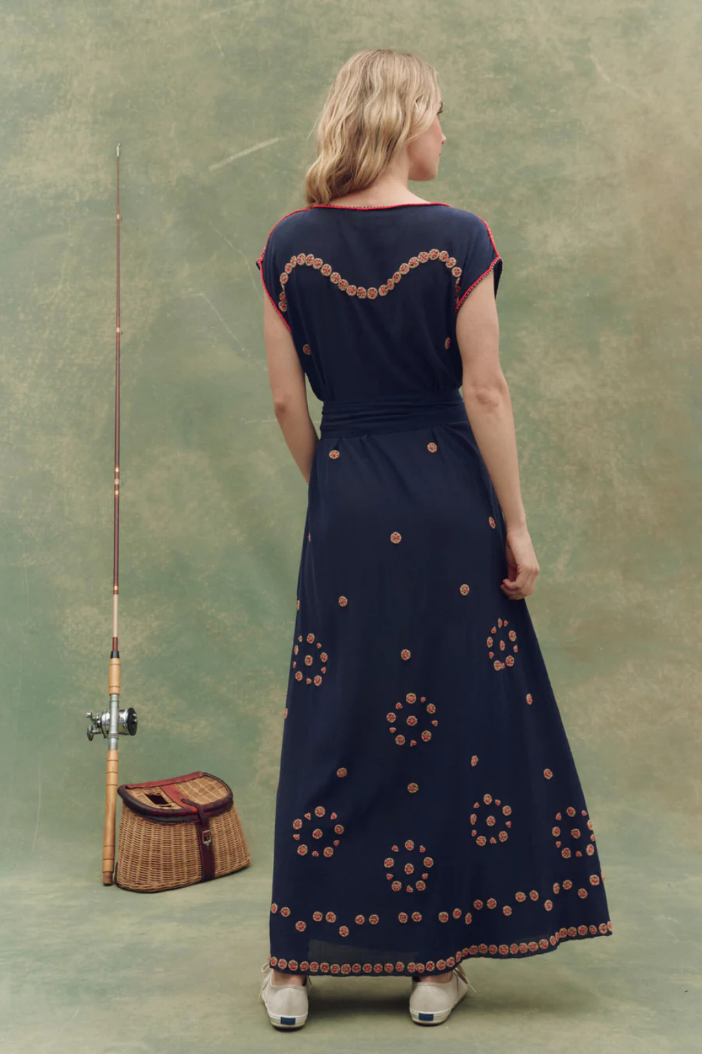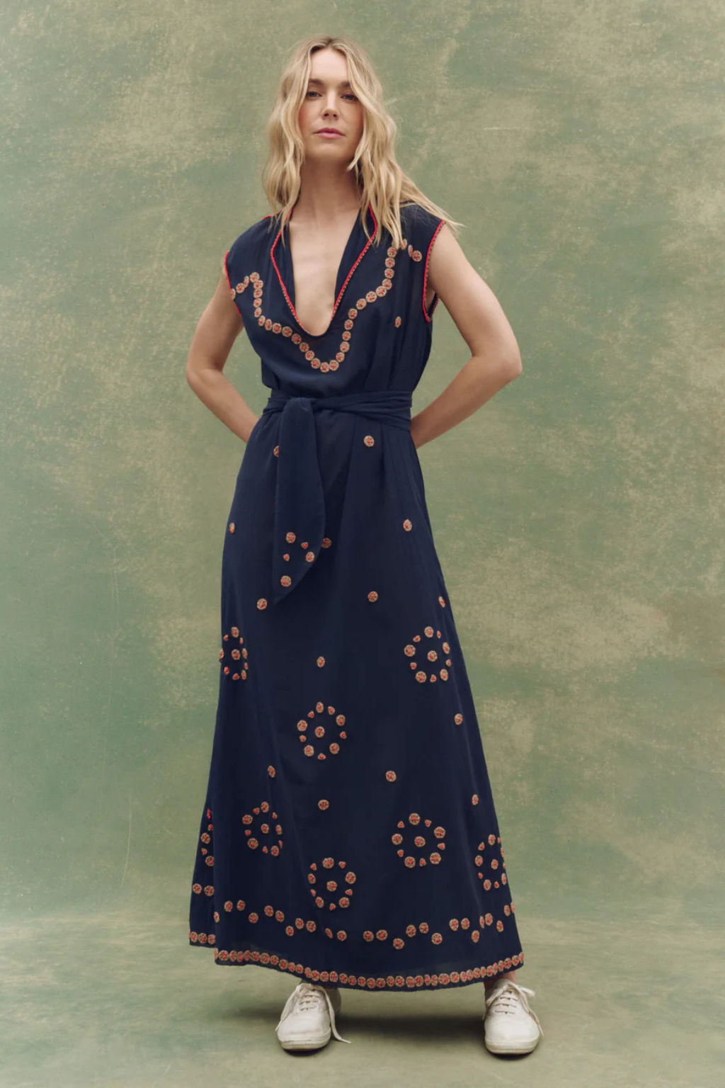 The Beaded Corridor Dress is a reimagining of a 1920s heirloom. Cut on the bias for natural drape, it features a deep V neckline, cap sleeves, and a low-slung waist seam that nods to the silhouettes of the era. The semi-sheer cotton is adorned with delicate hand-beading and rope-embroidered florets, echoing the artistry of the original piece it was modeled after. It comes with a separate cotton slip and a sash that can be worn tied or loose.